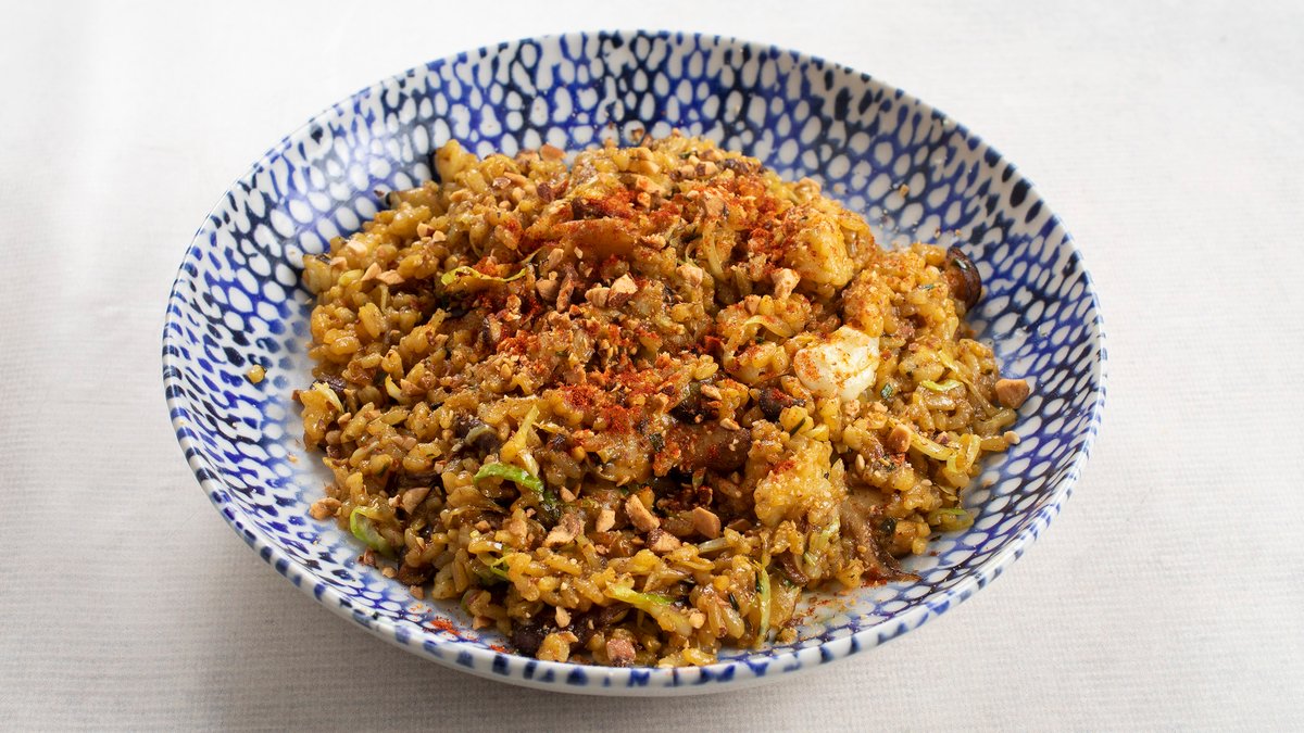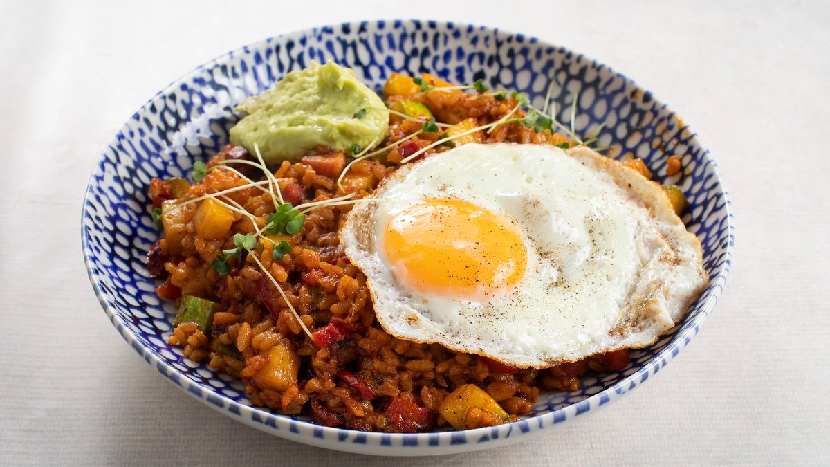 Pirinač, tikvica, paprika, slanina, jaje, guacamole