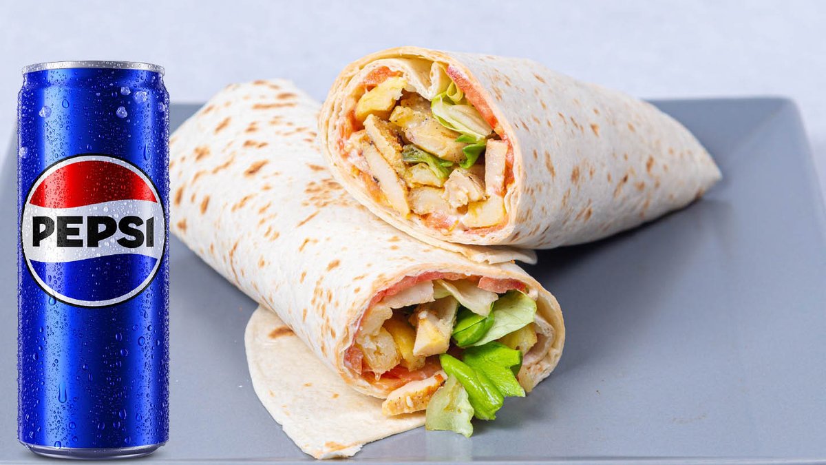 Tortilja, zelena salata, pileći file 120g, pomfrit 100g, majonez, paradajz, pavlaka
