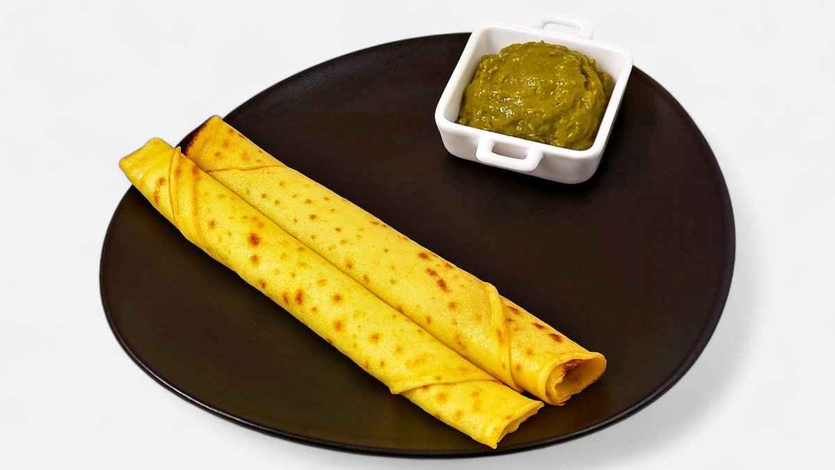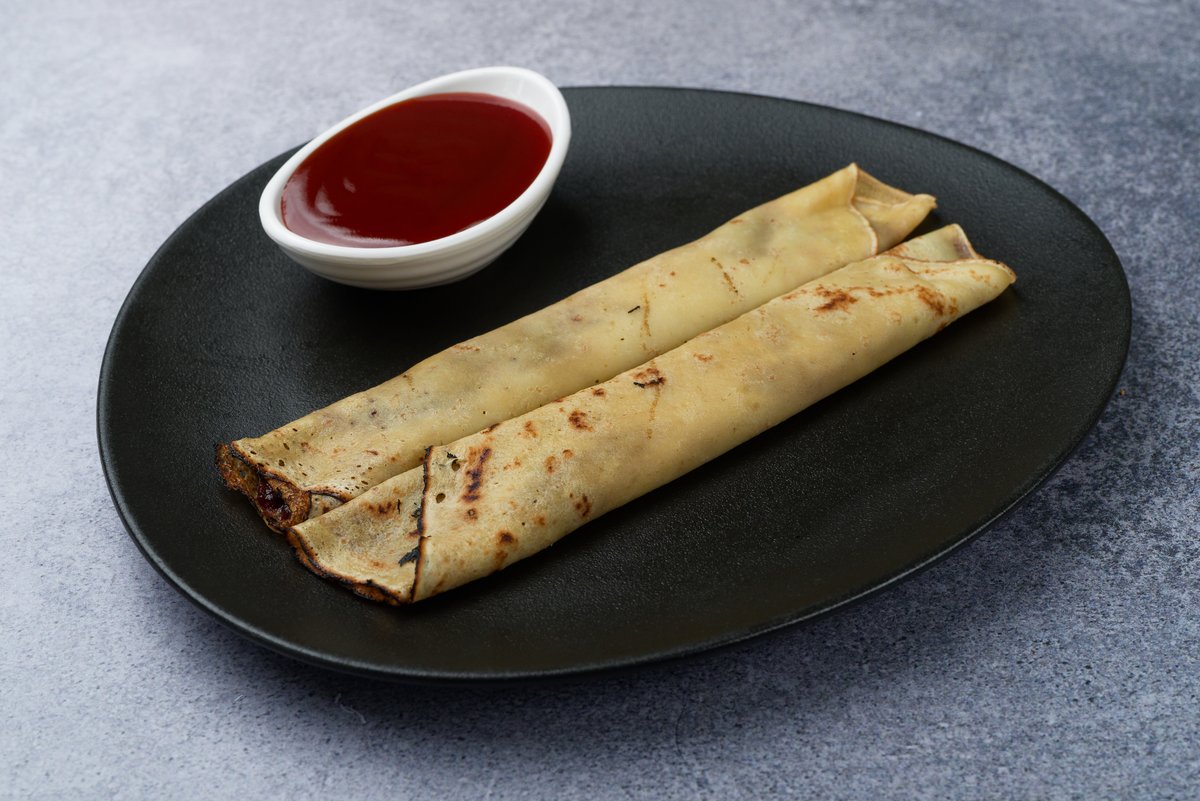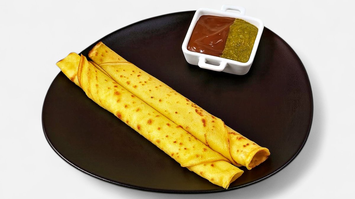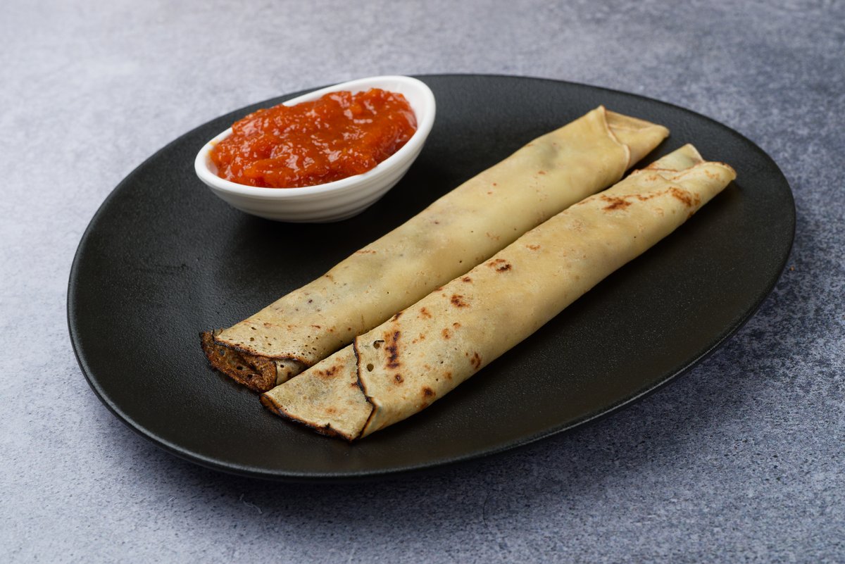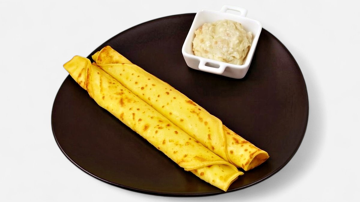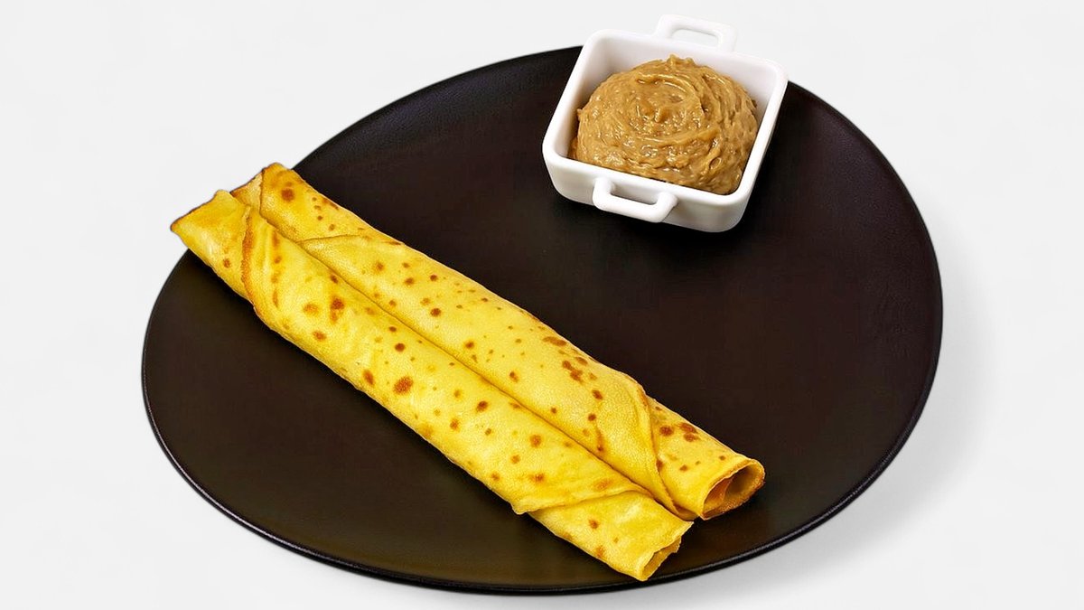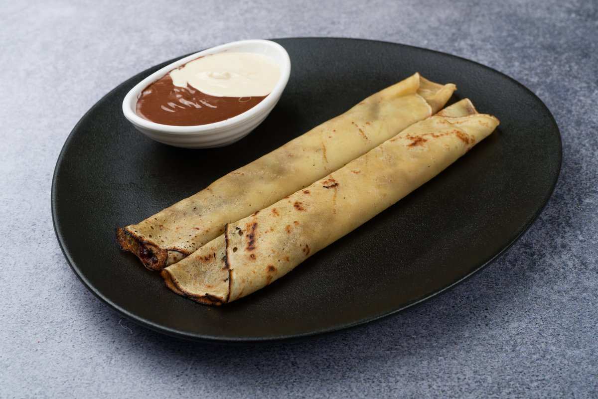 Dve palačinke iz tiganja filovane posnim eurokremom. Sastav testa: brašno, sojino mleko sa vanilom, šećer, so, ulje