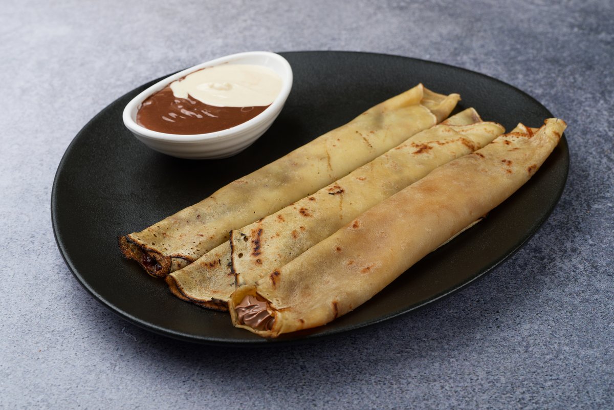 Tri palačinke iz tiganja filovane posnom plant based nutellom. Sastav testa: brašno, sojino mleko sa vanilom, šećer, so, ulje