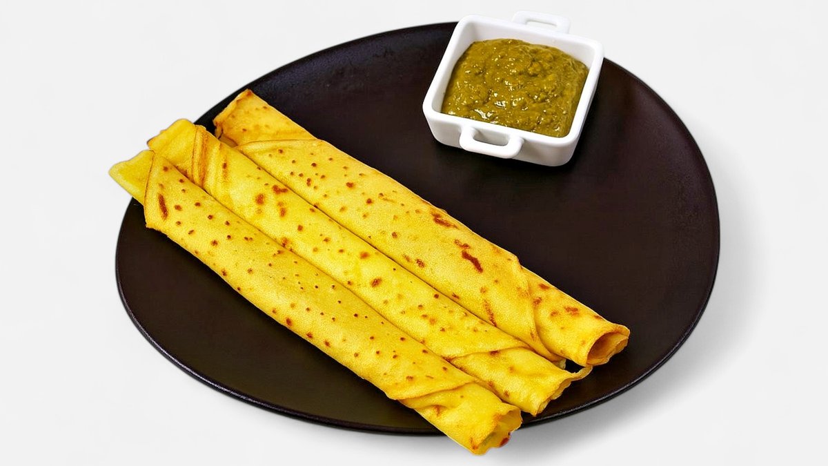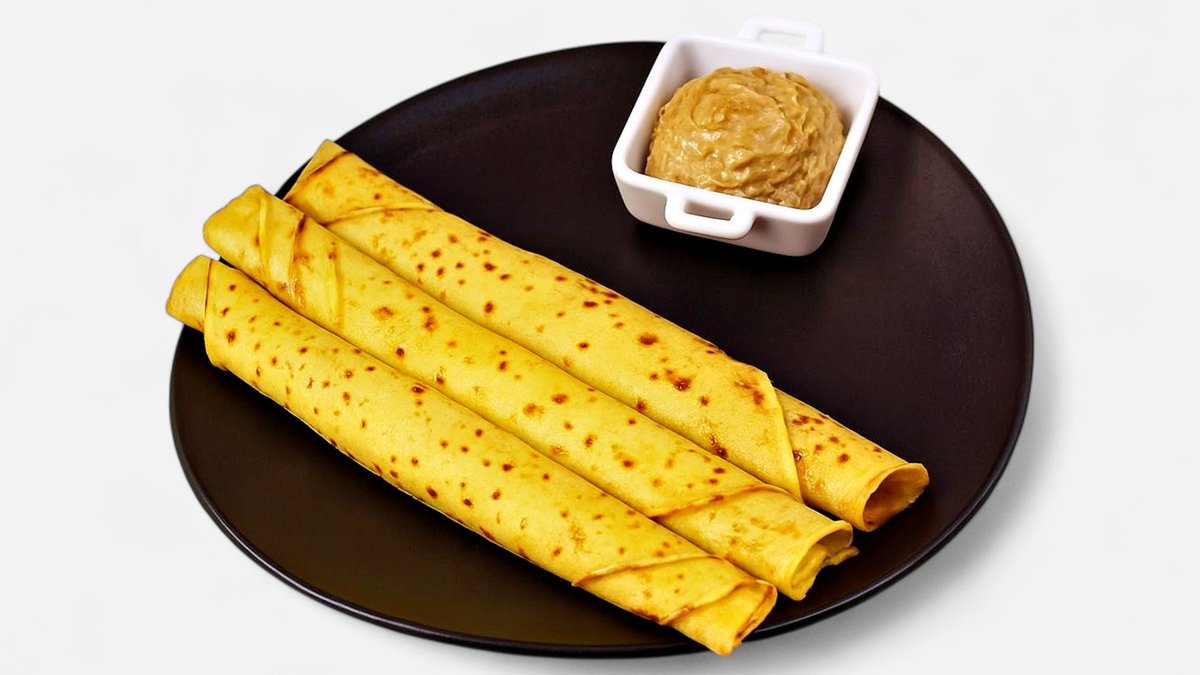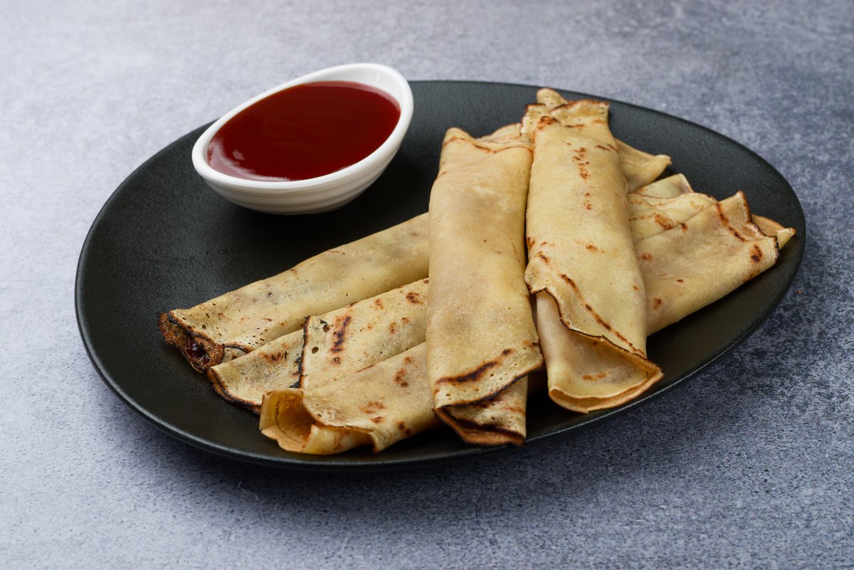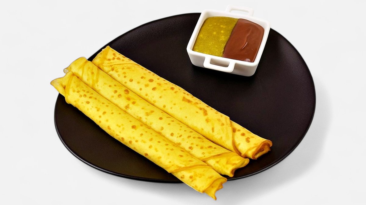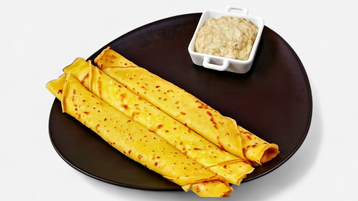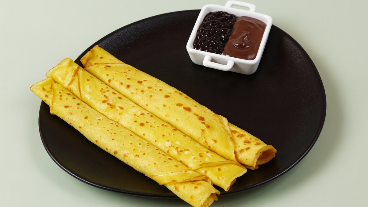 Tri palačinke iz tiganja filovane posnim eurokremom. Sastav testa: brašno, sojino mleko sa vanilom, šećer, so, ulje