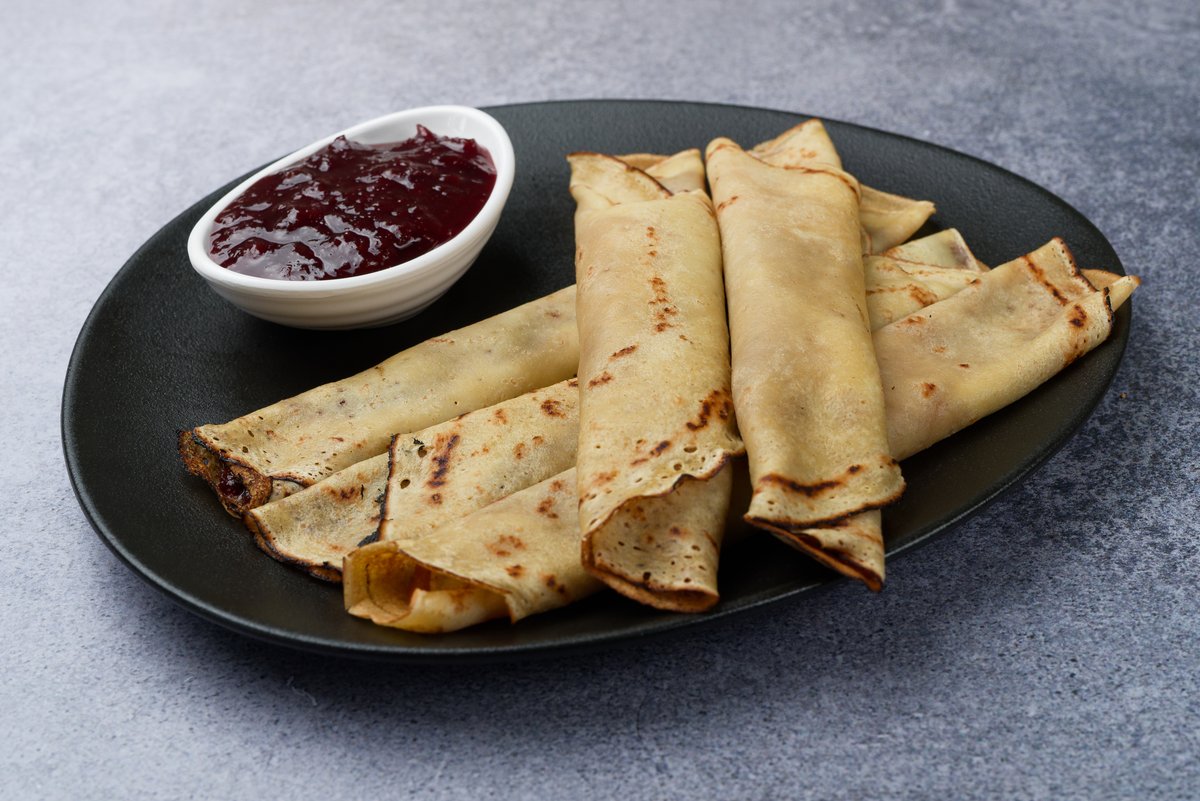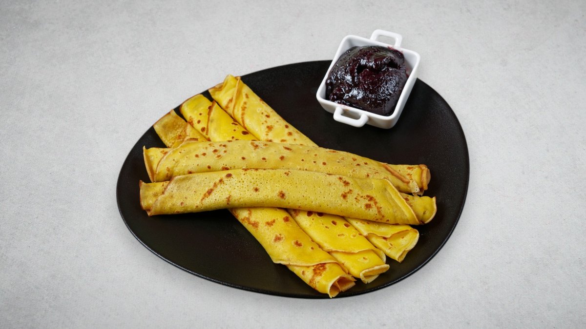 Dve domaće palačinke iz tiganja sa vrhunskim domaćim džemom od šipka. Brašno, jaja, 100% mleko, šećer, so, ulje