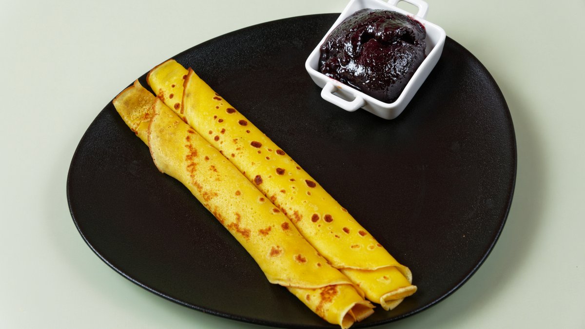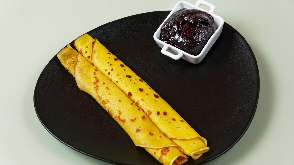 Dve domaće palačinke iz tiganja sa vrhunskim domaćim džemom od kupina. Brašno, jaja, 100% mleko, šećer, so, ulje