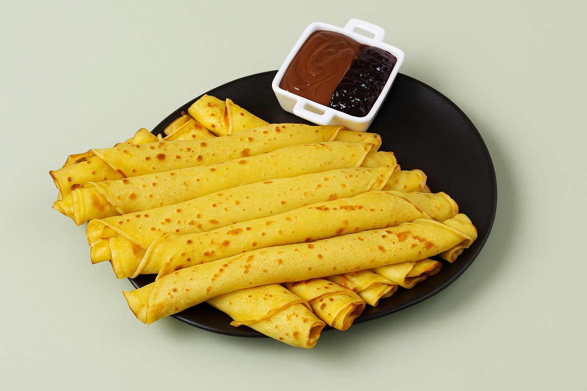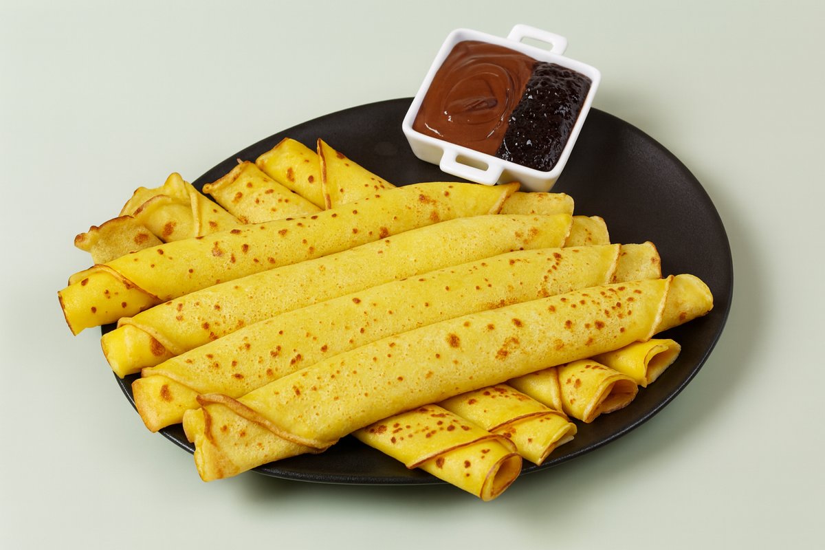 Osam domaćih palačinki iz tiganja sa eurokremom. Plus mogućnost dodavanja priloga. Brašno, jaja, 100% mleko, šećer, so, ulje