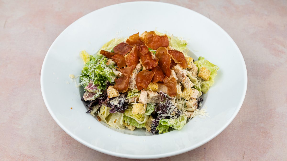 Iceberg salata, piletina, hrskava slanina, krutoni, parmezan, cezar dresing