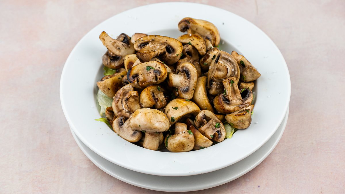 Šampinjoni posluženi na ajsberg salati sa majčinom dušicom , biberom i maslinovim uljem