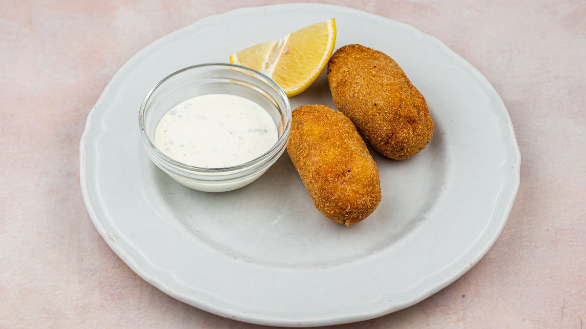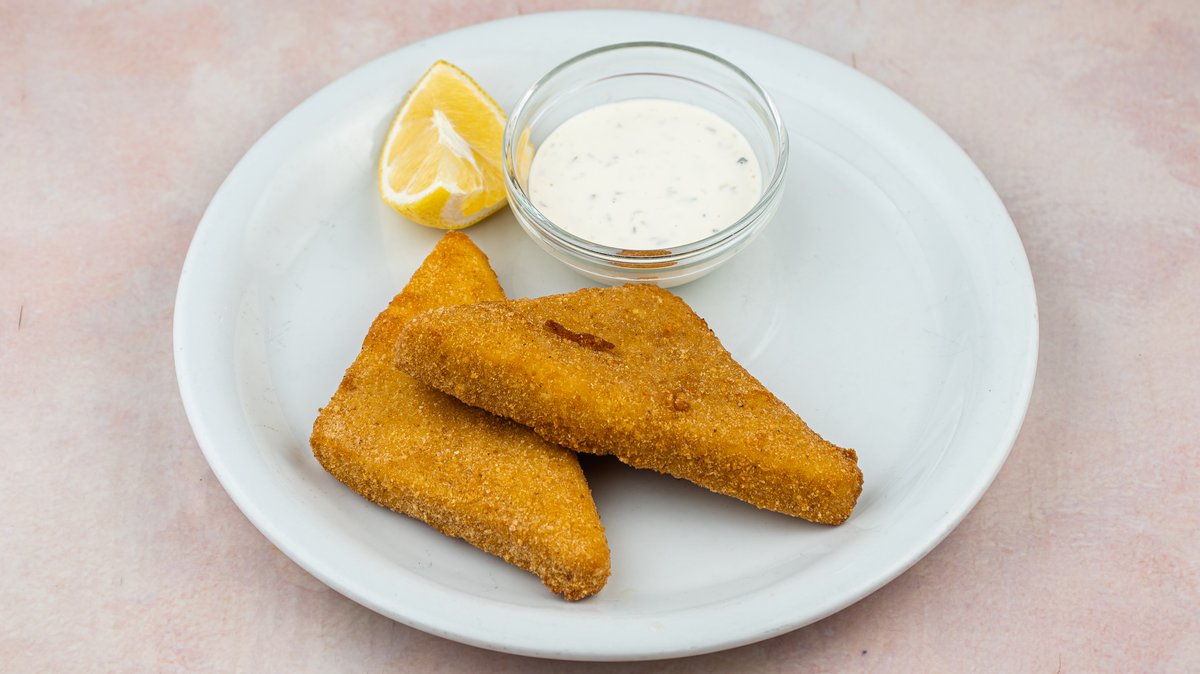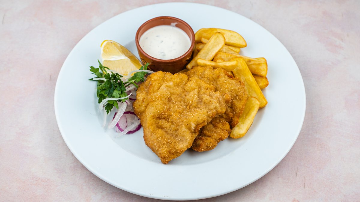 Pohovani svinjski file napunjen zrelim kajmakom, poslužen sa tartar sosom i pomfritom