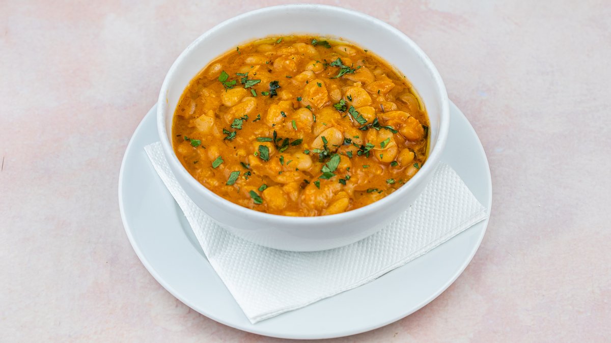 Zapečeni pasulj, beli luk, crvena slatka mlevena paprika