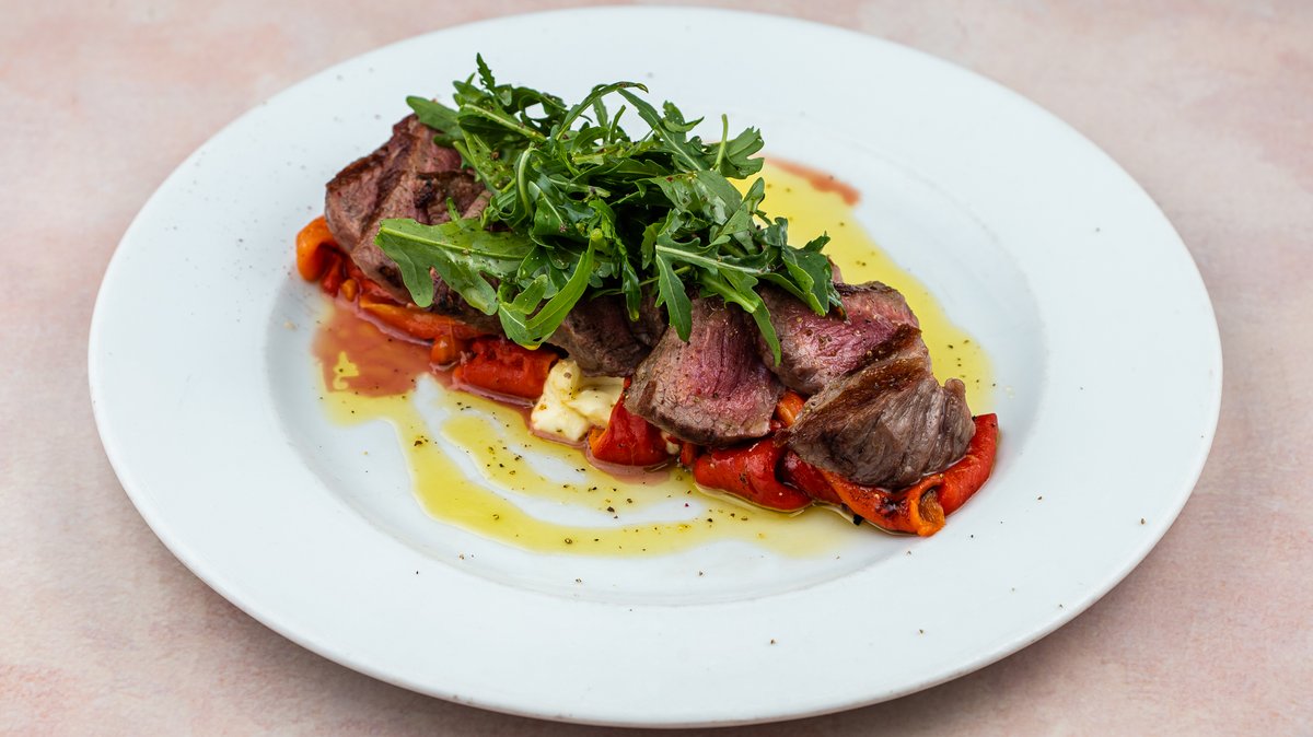 Taljata od ramsteka poslužena na podlozi od pečenih paprika i zlatarskog sira