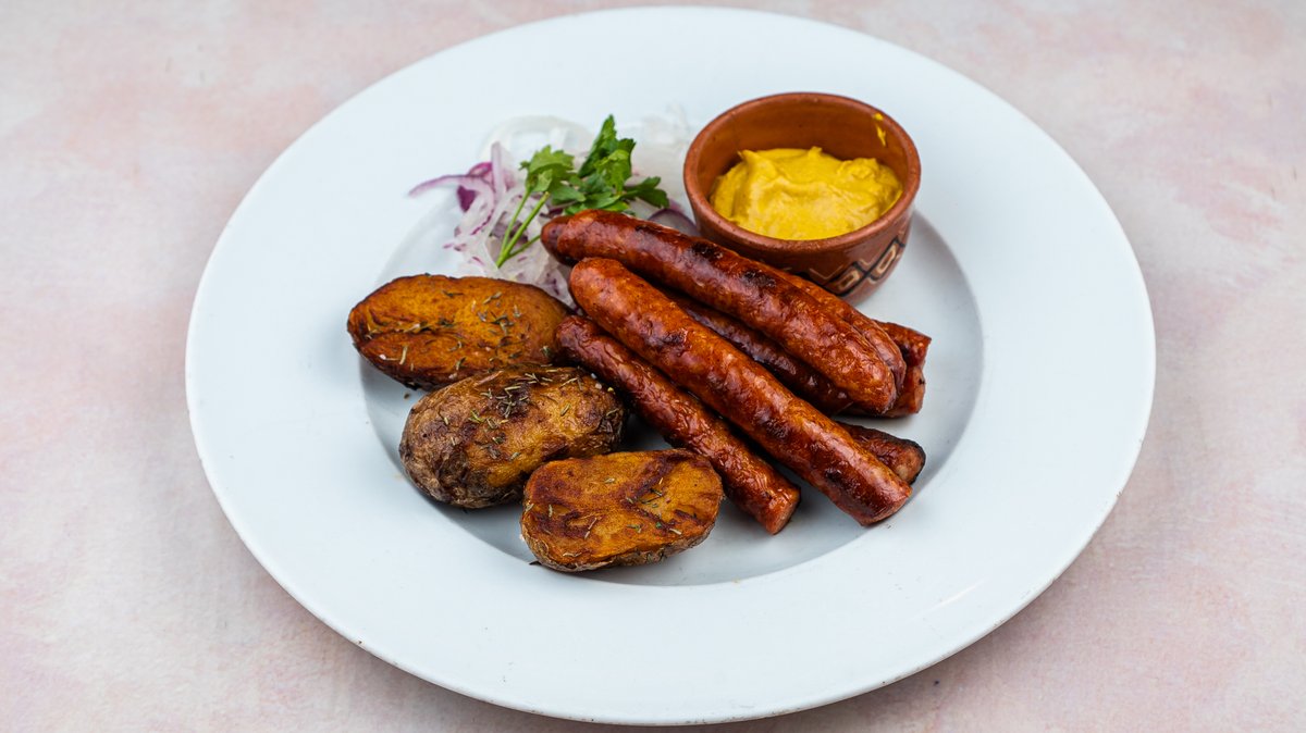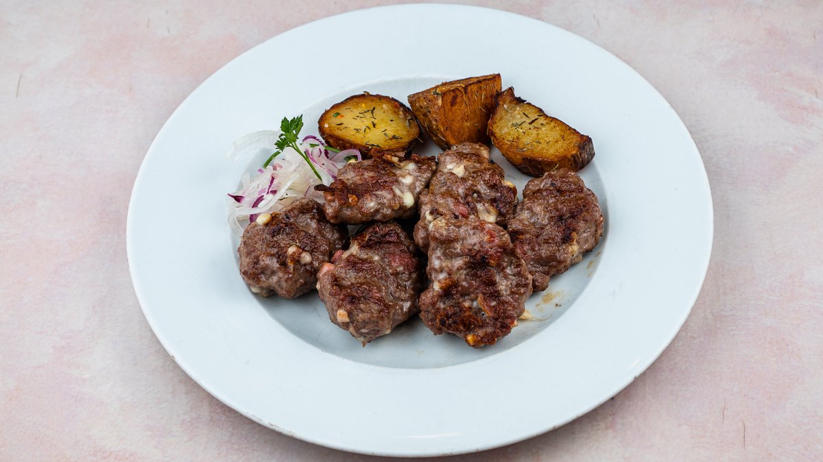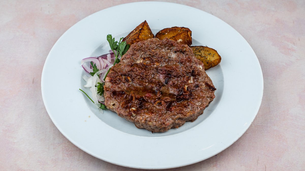 350 grama, čisto juneće meso sa dodatkom slaninice i kačkavalja, pikantno, poslužena sa pečenim krompirom