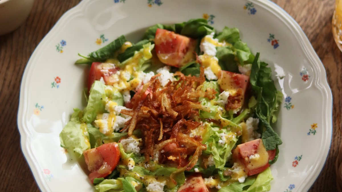 Composite breakfast consisting of: svinskij vrat, egg, ajvar, sandwich with kajmak and mini šopska salad