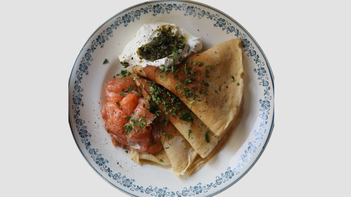 Sandwich on square bread Inside: Gouda cheese, pork vrat, lettuce, red onion, ajvar sauce and sour cream Served with country-style potatoes and mustard and sour cream sauce