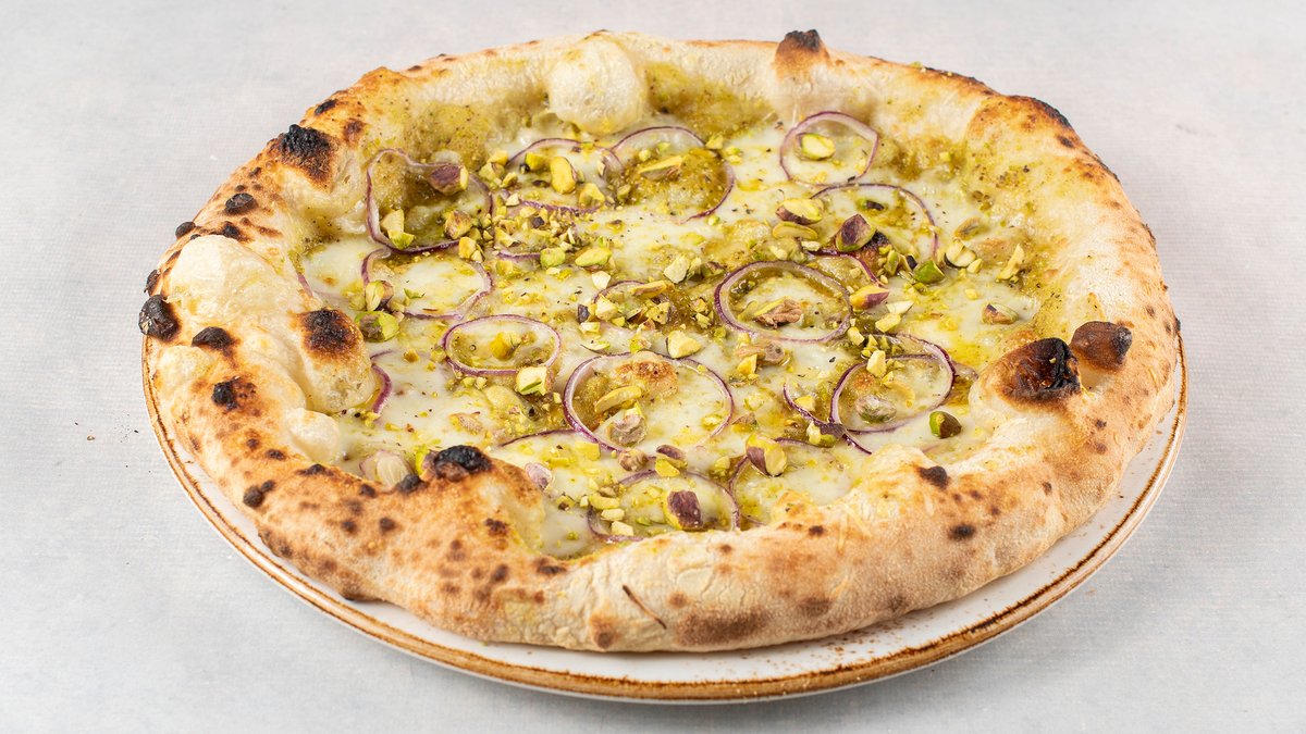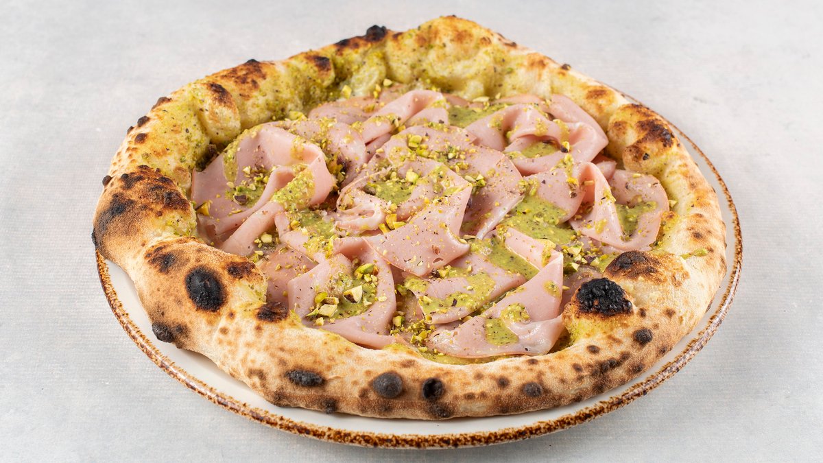 Pistać krema, bosiljak, mozzarella Fior di Latte, malsinovo ulje, mortadela, mrvljeni pistać