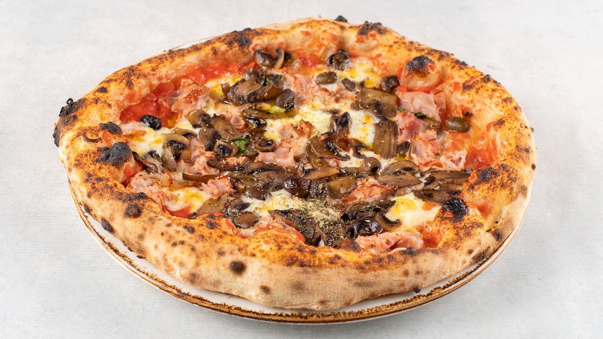 Pelat, Grana Padano, mozzarella, prosciutto cotto, šampinjoni, masline, origano