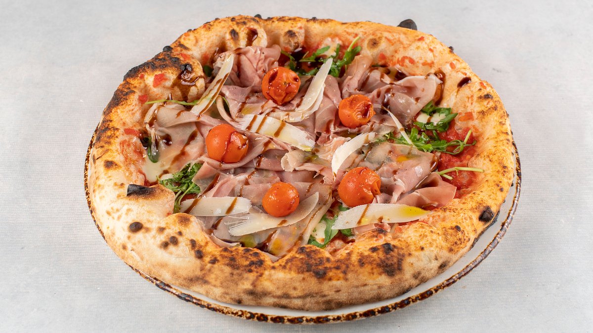 Pizza testo, Stracciatella, Grana Padano parmezan, pršuta San Daniele, cherry confit, rukola