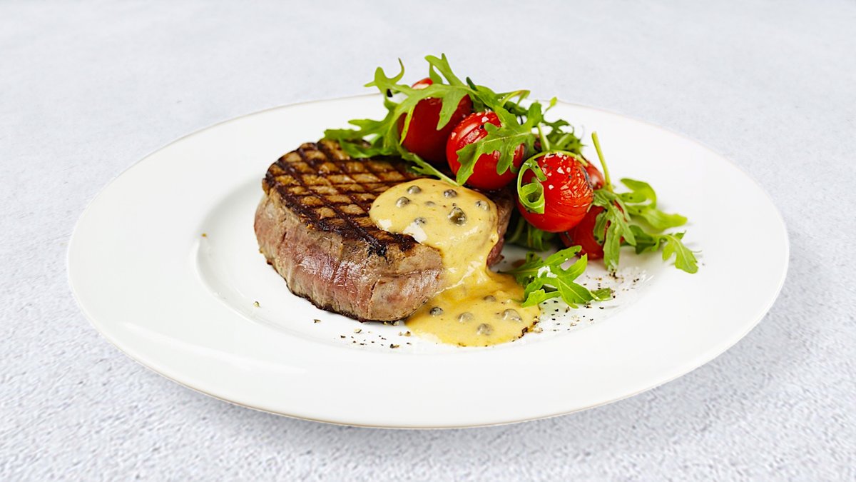 Ukupna težina porcije 600 gr (meso & prilozi). Medaljoni bifteka 250 gr, preliveni sosom od zelenog bibera, sa dva priloga u porciji - grilovano povrće i prženi krompirići.
