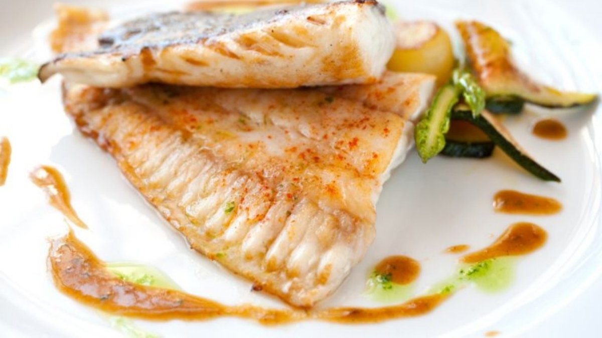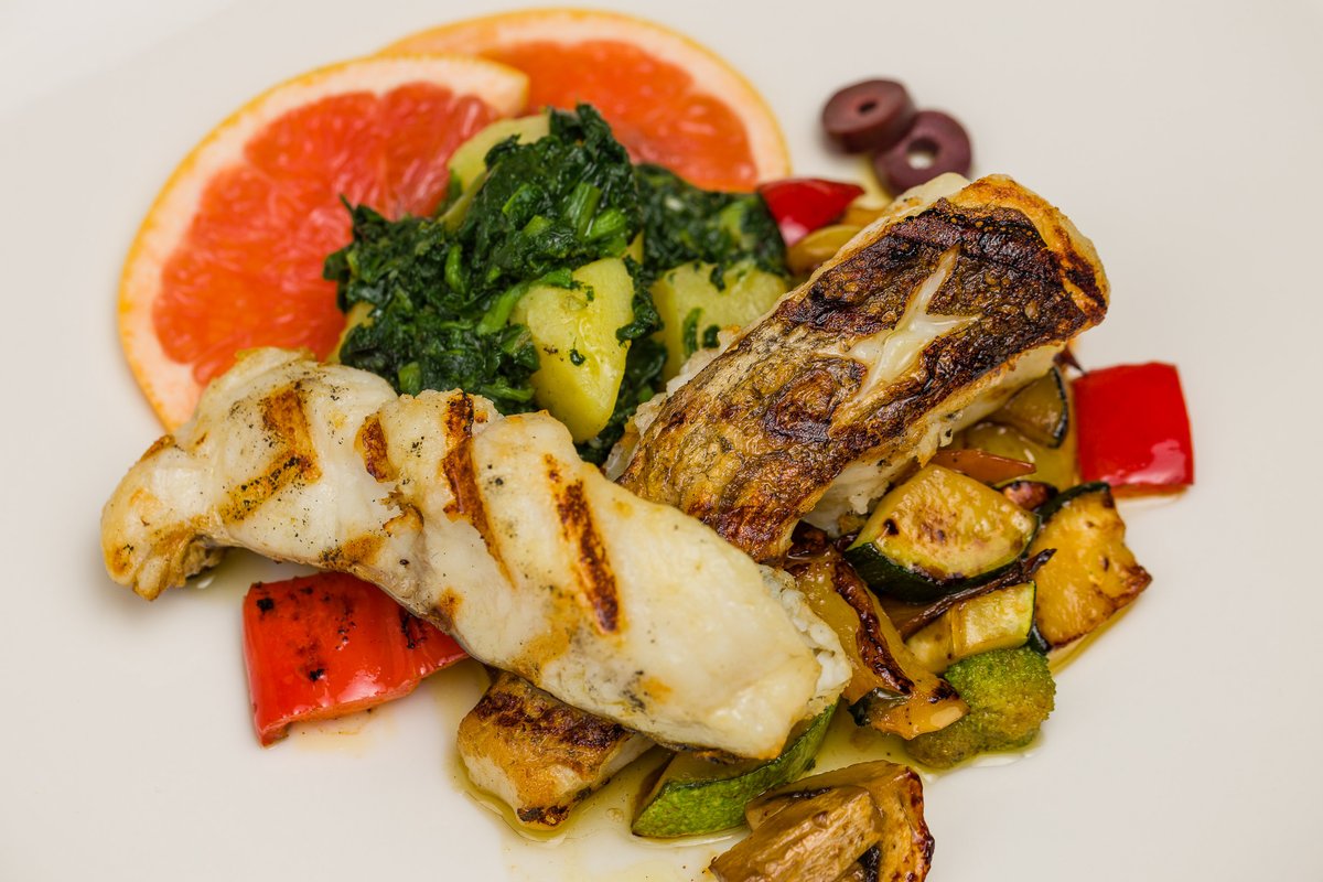 Ukupna težina porcije - 570 gr. Fileti luca (270 gr), sa sosom od redukovanog belog i crvenog vina i balzamika, servirani na podlozi od blitve i krompira sa grilovanim povrćem i trećim prilogom, menjamo ga često