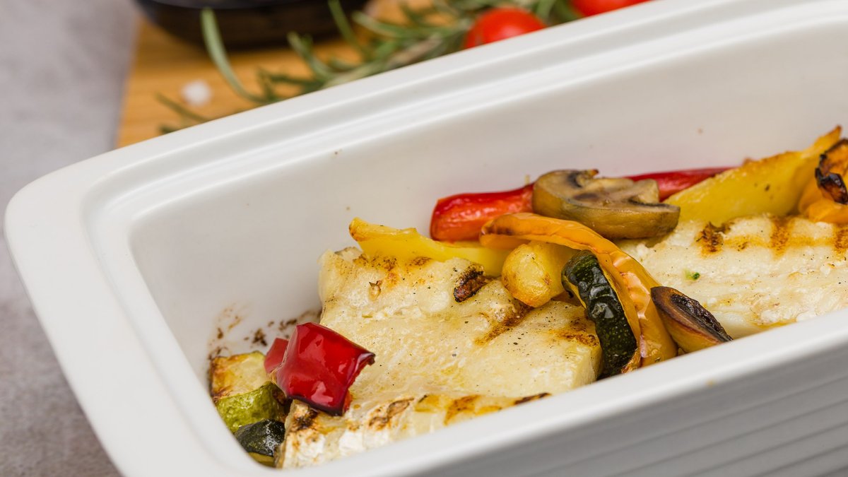 Ukupna težina porcije 560 gr (riba & prilozi). Fileti bakalara 270 gr, krompir, sezonsko povrće, belo vino, ruzmarin, kapar, masline