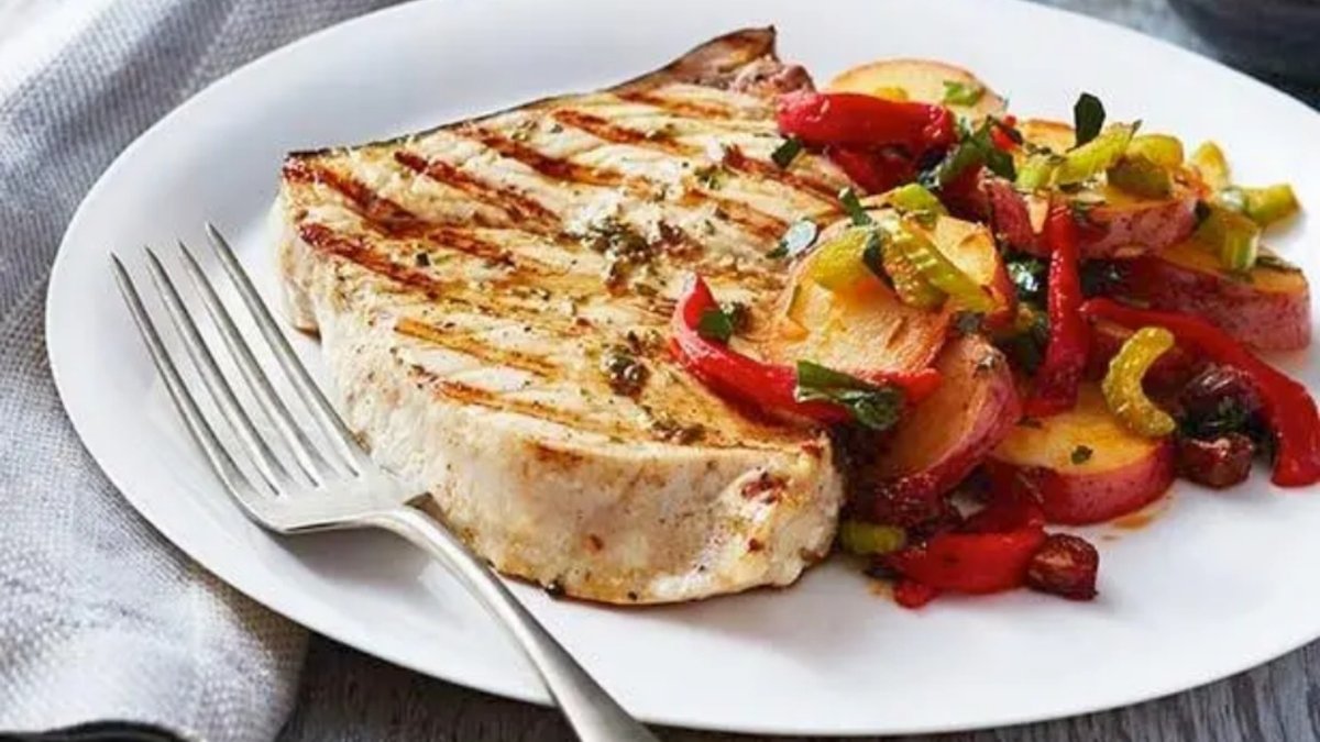 Ukupna težina porcije 560 gr (riba & prilozi). Kotleti morskog psa 270 gr, krompir, sezonsko povrće, belo vino, ruzmarin, kapar, masline
