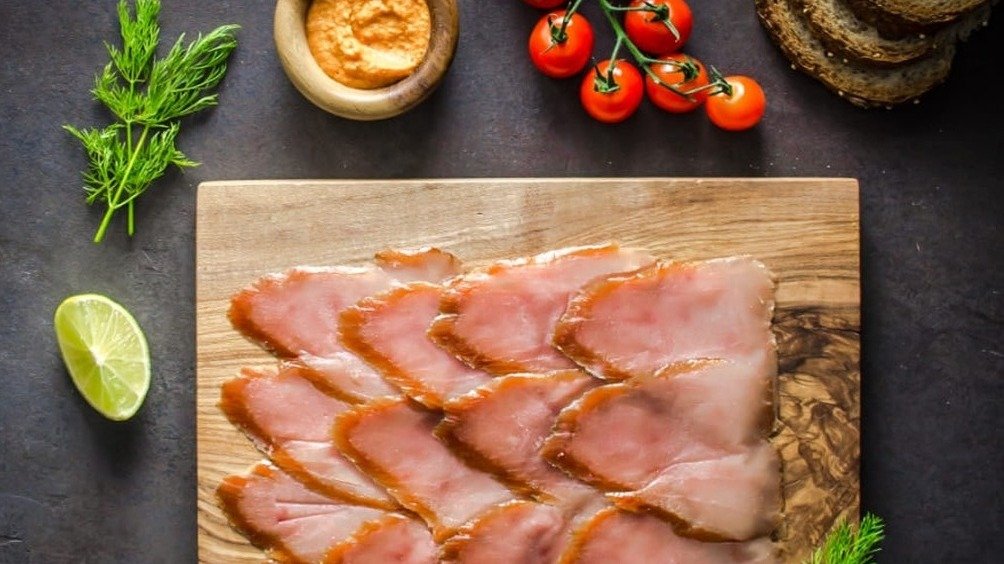 100 gr pršute od dimljene tune. Serviramo je sa mariniranim crvenim lukom i prepečenim hlebom. Savršeno predjelo.