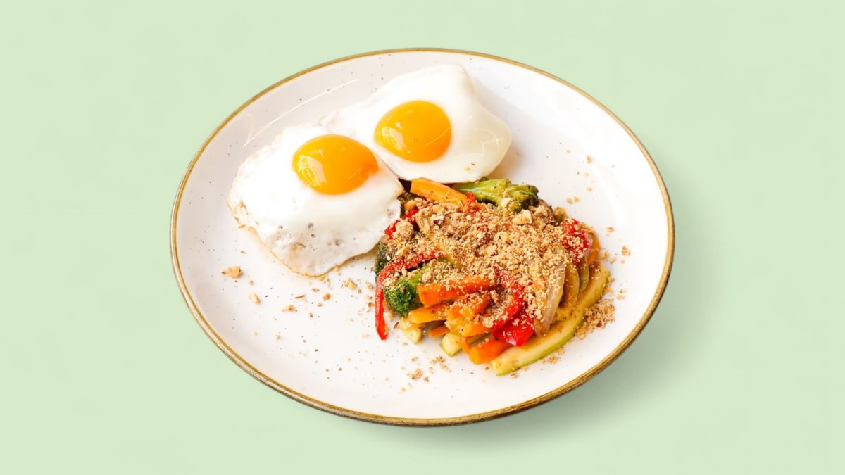 Jaja, paprika, pečurke, tikvice, praziluk (288 kcal, 6g ugh, 19g m, 23g p)
