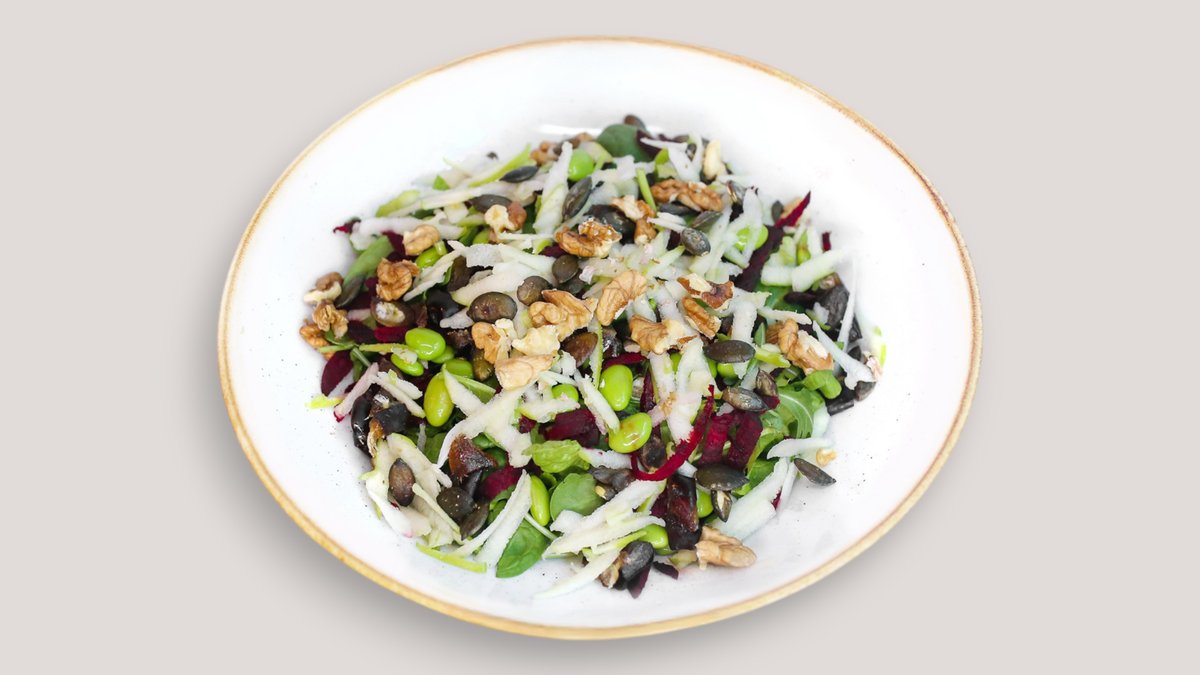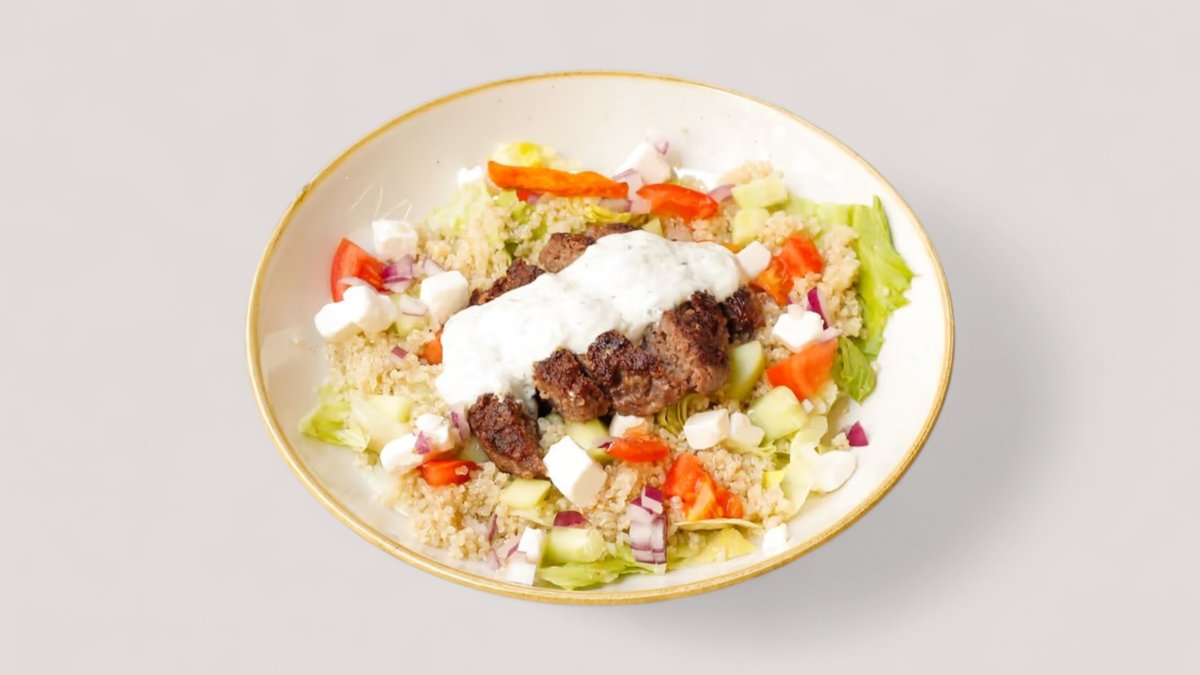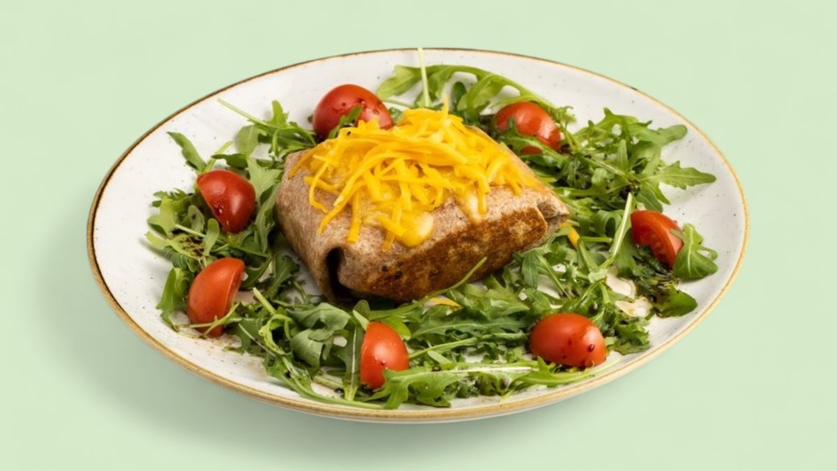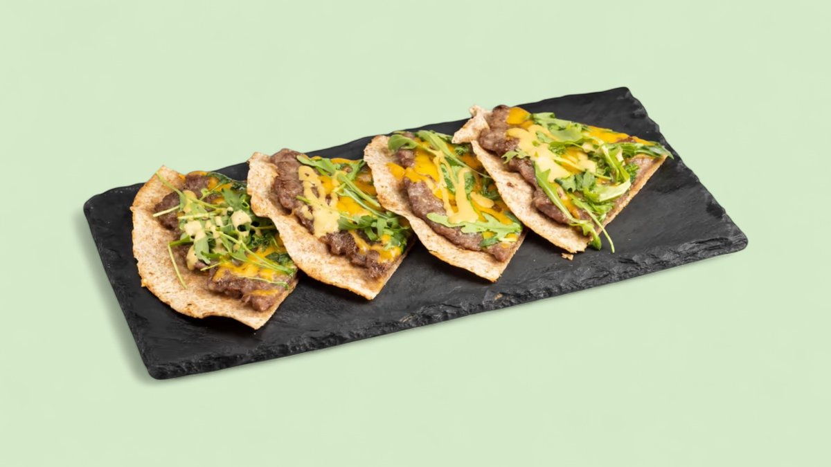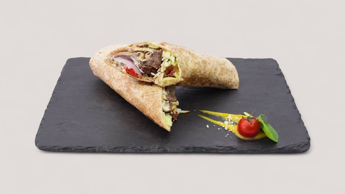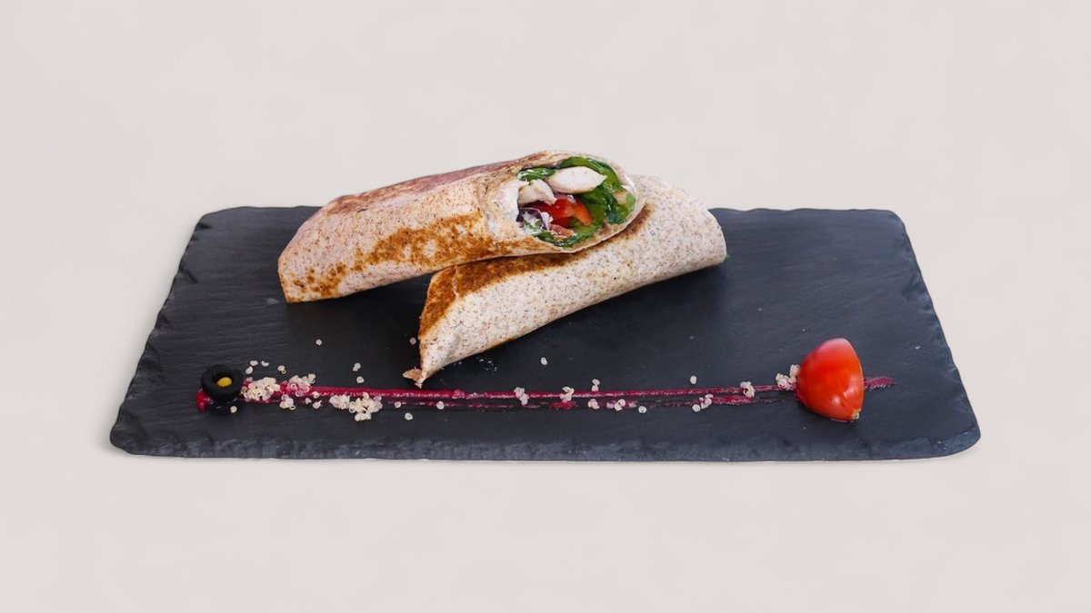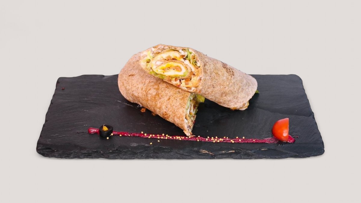 Tortilja od celog zrna, juneći mleveno meso, čedar sir, rukola, majonez od orašastih plodova, praziluk 731 kcal, 47g ugh, 38g m, 50g p