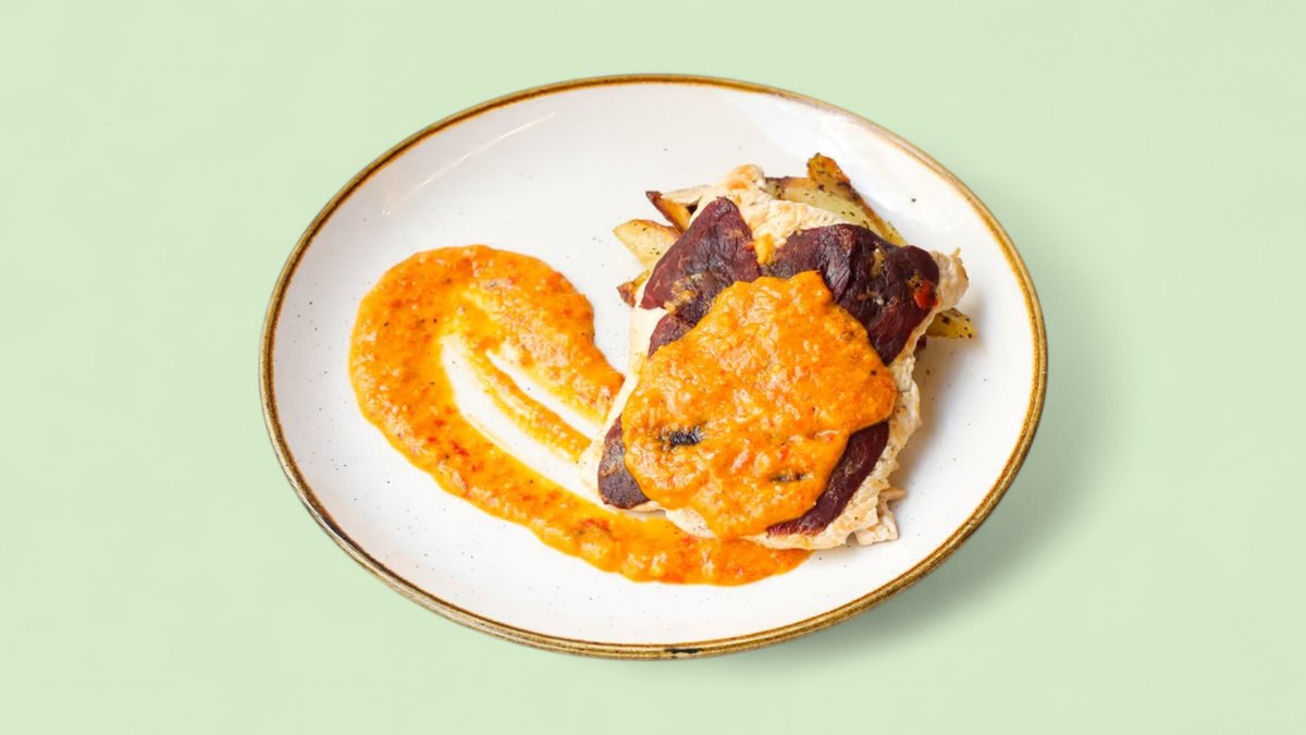 Pileći file, mocarela, sušeni paradajz, paprika, puter, beli luk (688 kcal, 63g ugh, 30g m, 41g p)
