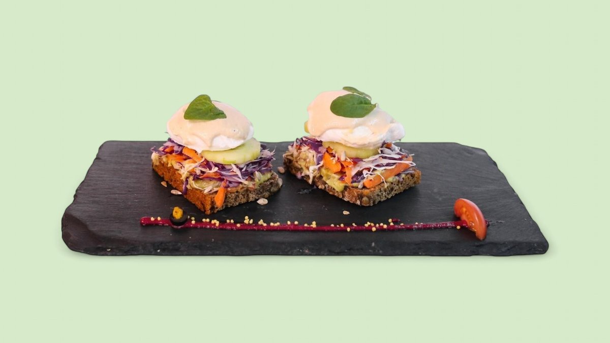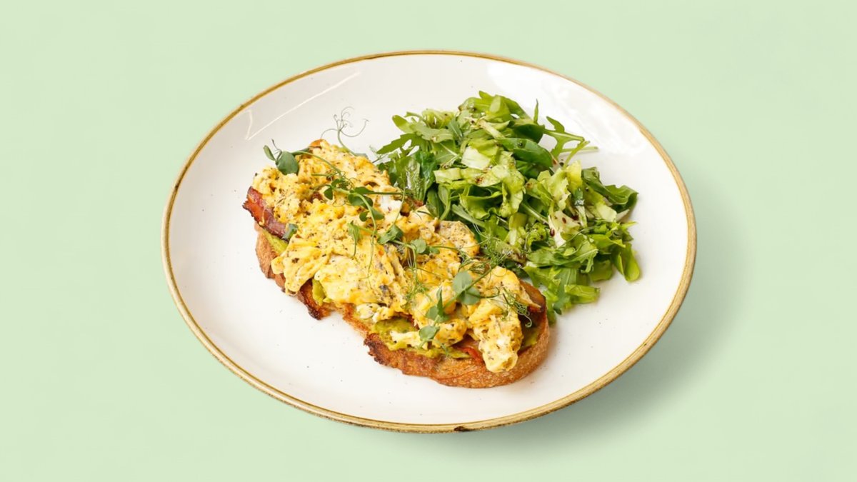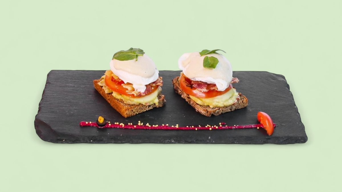 Hleb od celog zrna, guacamole, jaja, paradajz, pančeta, krastavac, majonez od orašasastih plodova (637 kcal, 43g ugh, 37g m, 27g p)