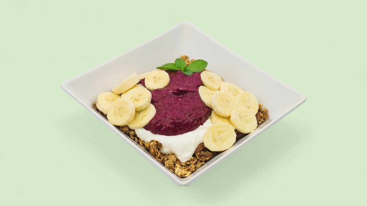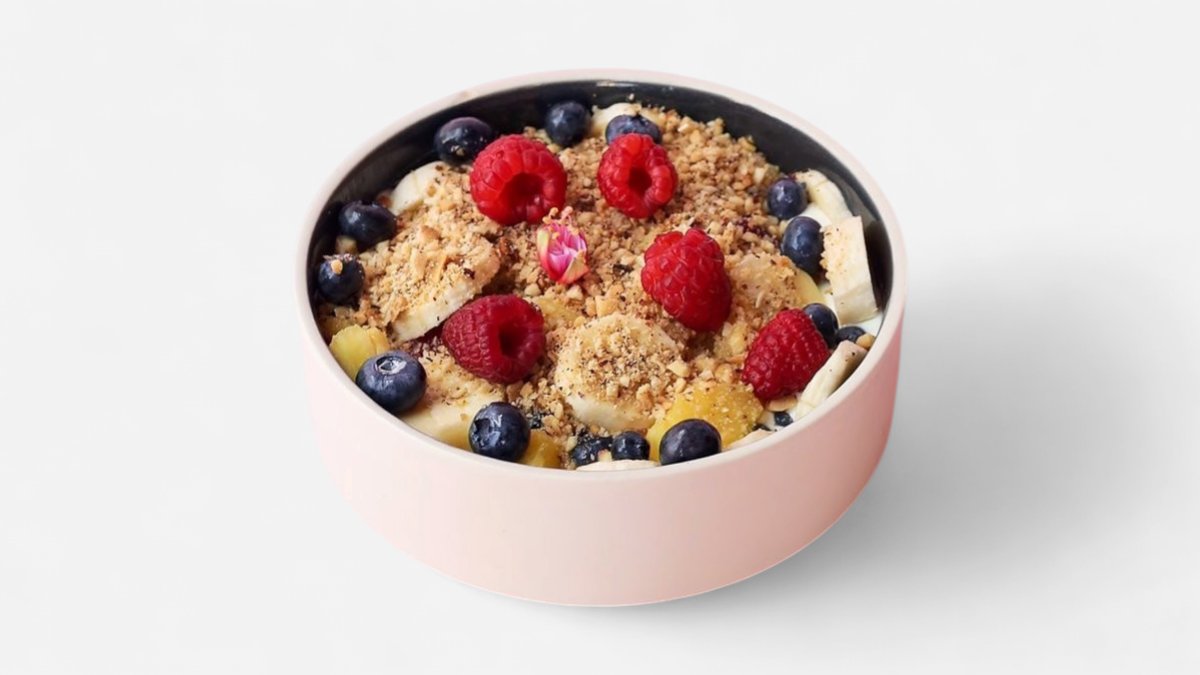asai prah, kokosov protein, ovsene pahuljice, čia seme, sojino mleko, grčki jogurt, maline, banana, ananas , kokos listići, homemade granola (501 kcal, 66g ugh, 15g m, 25g p)