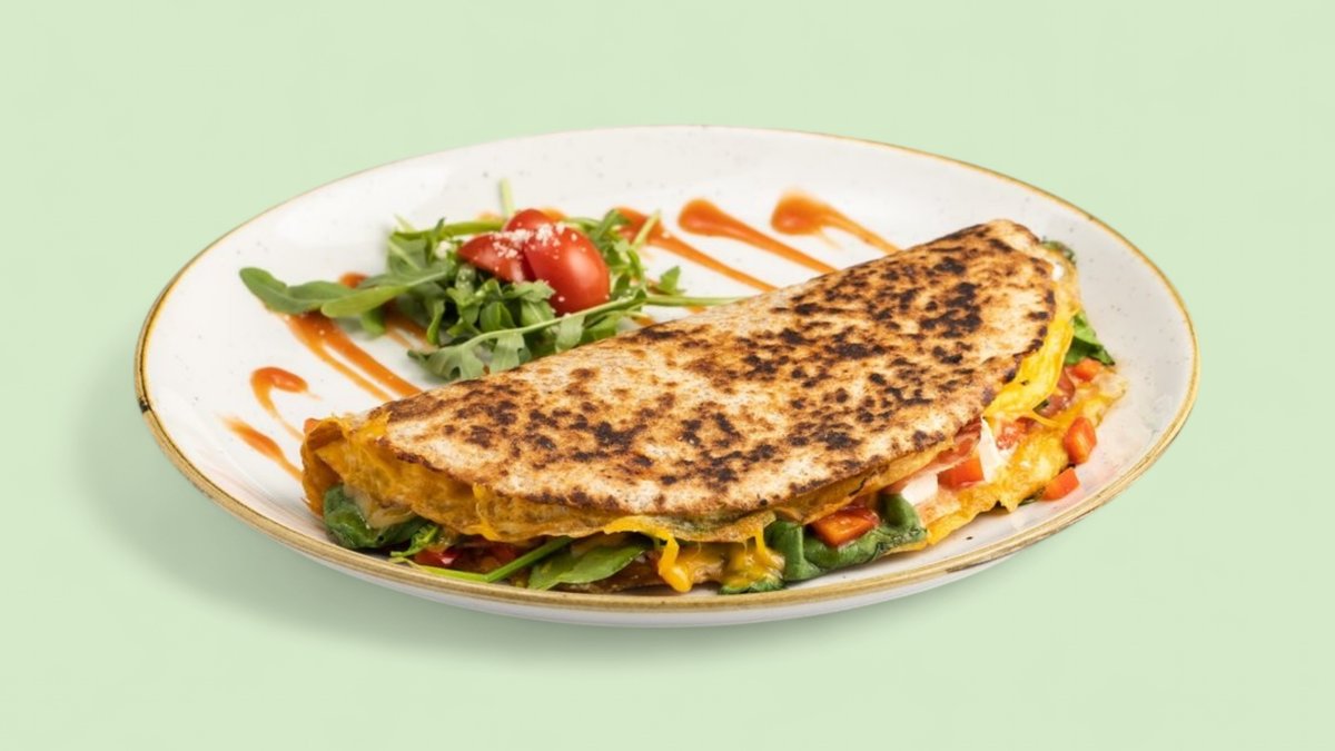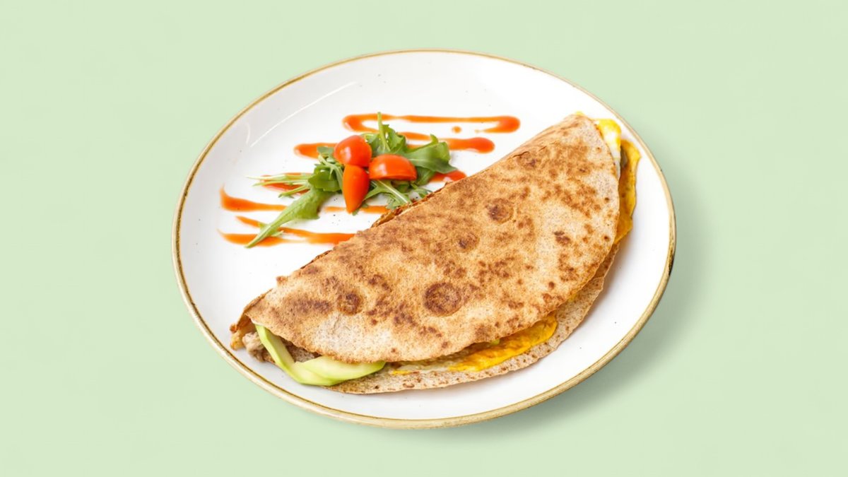 Tortilja od celog zrna, jaja, goveđa pršuta, čedar sir, paprika, spanać, feta sir, zero kečap 678 kcal, 44g ugh, 35g m, 47g p