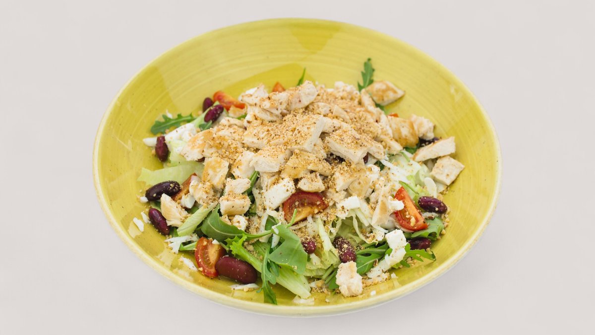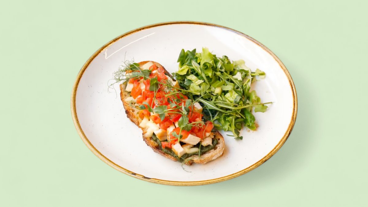 hleb od kiselog testa, pileći file, domaći pesto sos, mocarela, paradajz, mix zelenih salata (514 kcal, 31g ugh, 26g m, 39g p)