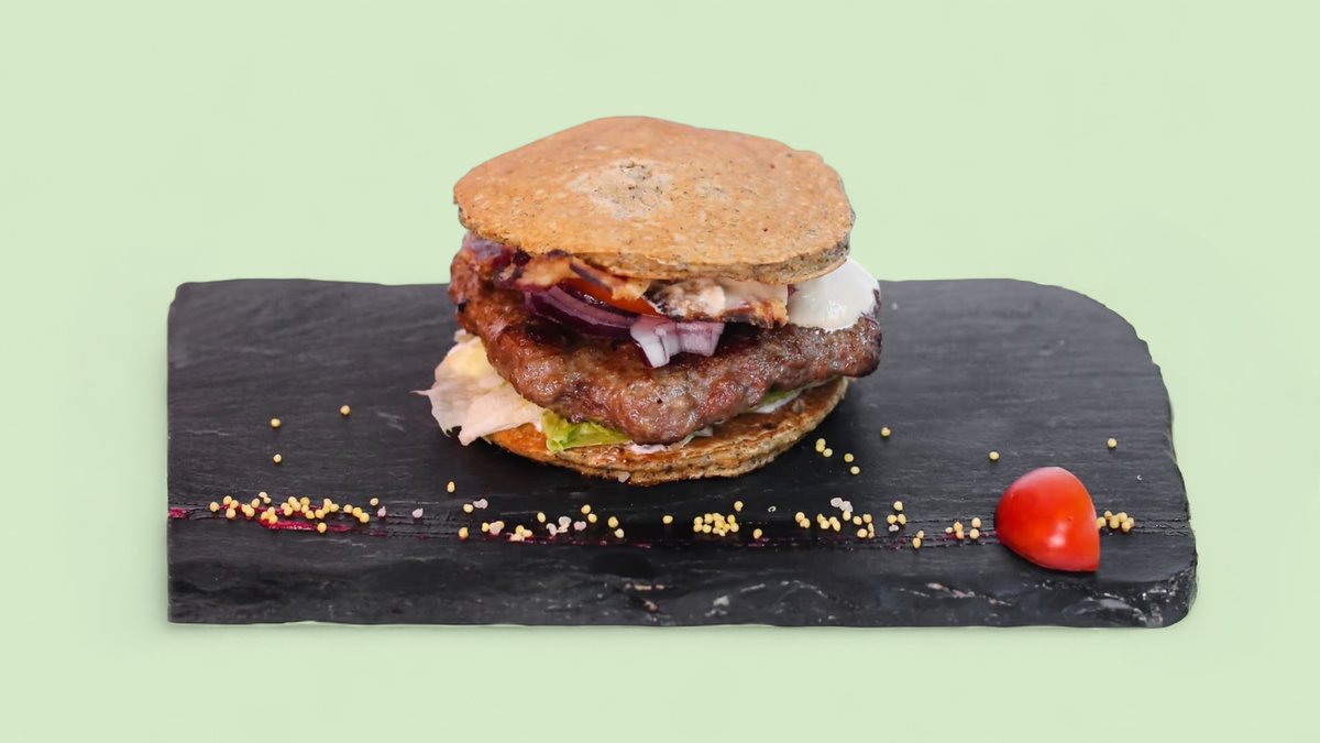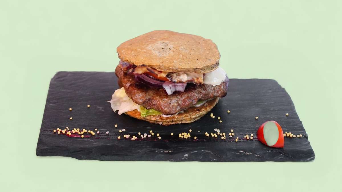 Juneći burger, mlečni namaz, dimljeni kačkavalj, dižon senf, paprika, sušeni paradajz, ajzberg salata, crveni luk (558 kcal, 47g ugh, 24g m, 39g p)