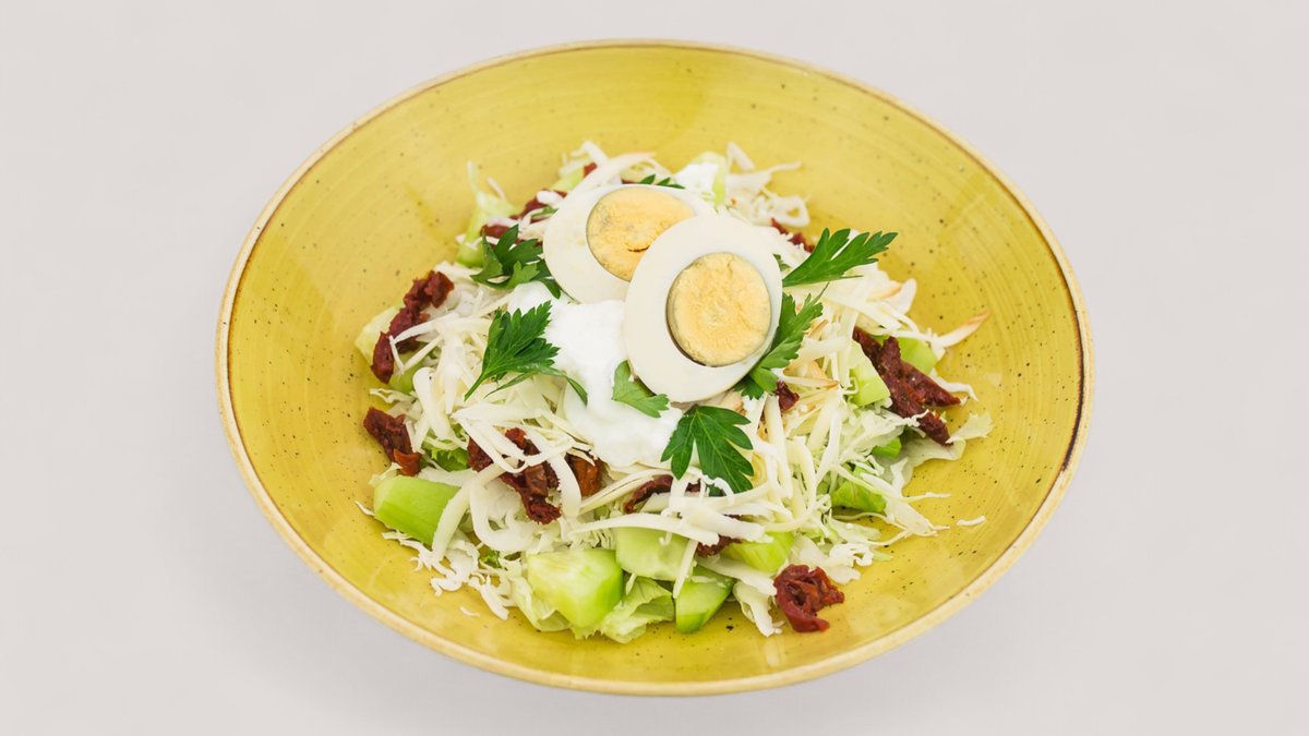 Jaja, mlečni namaz, feta sir, pančeta, ajzberg salata (560 kcal, 43g ugh, 28g m, 34g p)