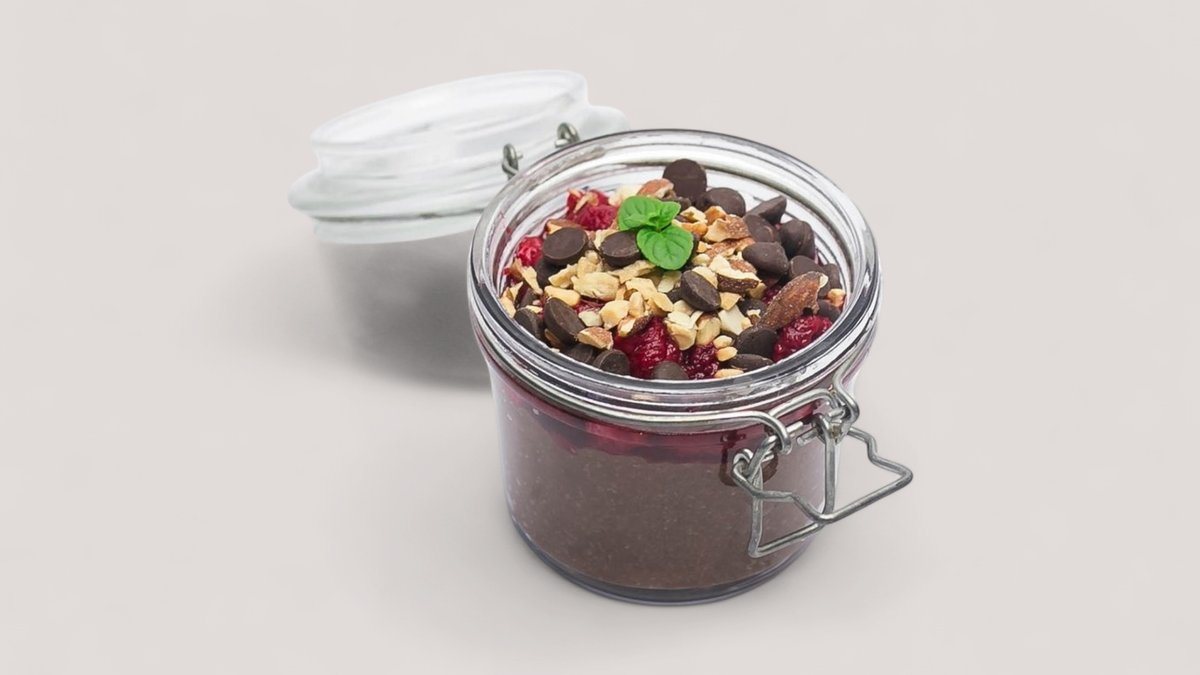 Čia semenke, mleko, kakao, whey protein čokolada, maline, badem, crna čokolada (395 kcal, 28g ugh, 19g m, 28g p)
