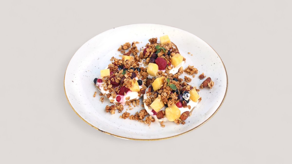 Granole sa medom i bademima, čia džem od šumskog voća, grčki jogurt, banana (584 kcal, 85g ugh, 18g m, 19g p)