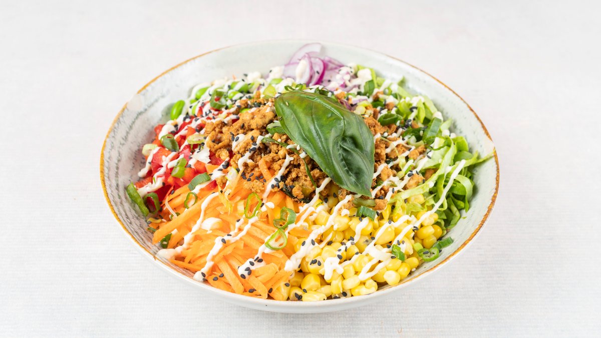 Mleveno meso u ojster sosu, pirinač, mladi luk, kukuruz, crveni luk, šargarepa, edamame, avokado, zelena salata, majonez sa tartufima, crni susam.