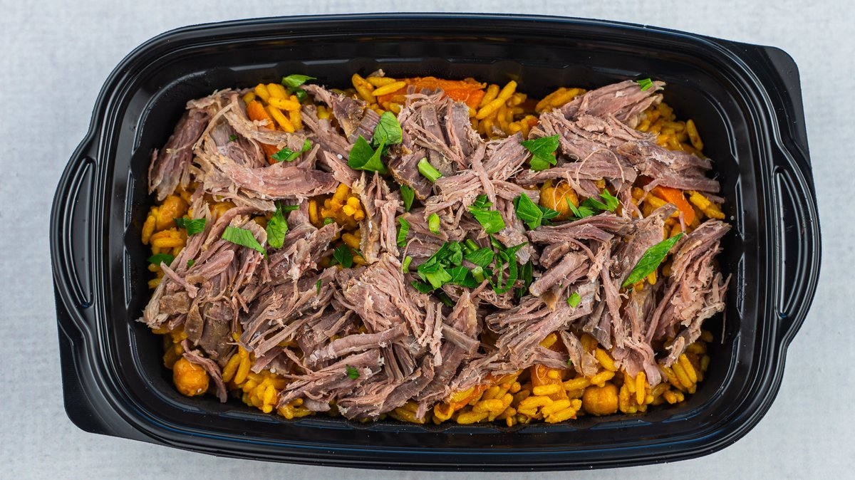 Parboiled pirinač, Luk, Šargarepa, Leblebiji, Tamne suve grožđice, Svež beli luk, Kim, Korijander, Govedina, Svež peršun