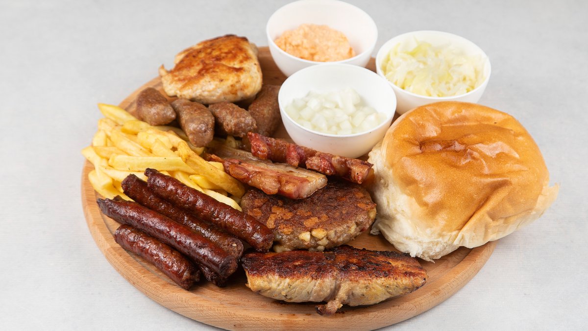 Gurmanska pljeskavica 150g, kobasica 150g, ćevapi 150g, pileće belo 150g, dimljena slanina150g, pomfrit 200g, lepinja 3kom, kupus slata,luk,urnebes