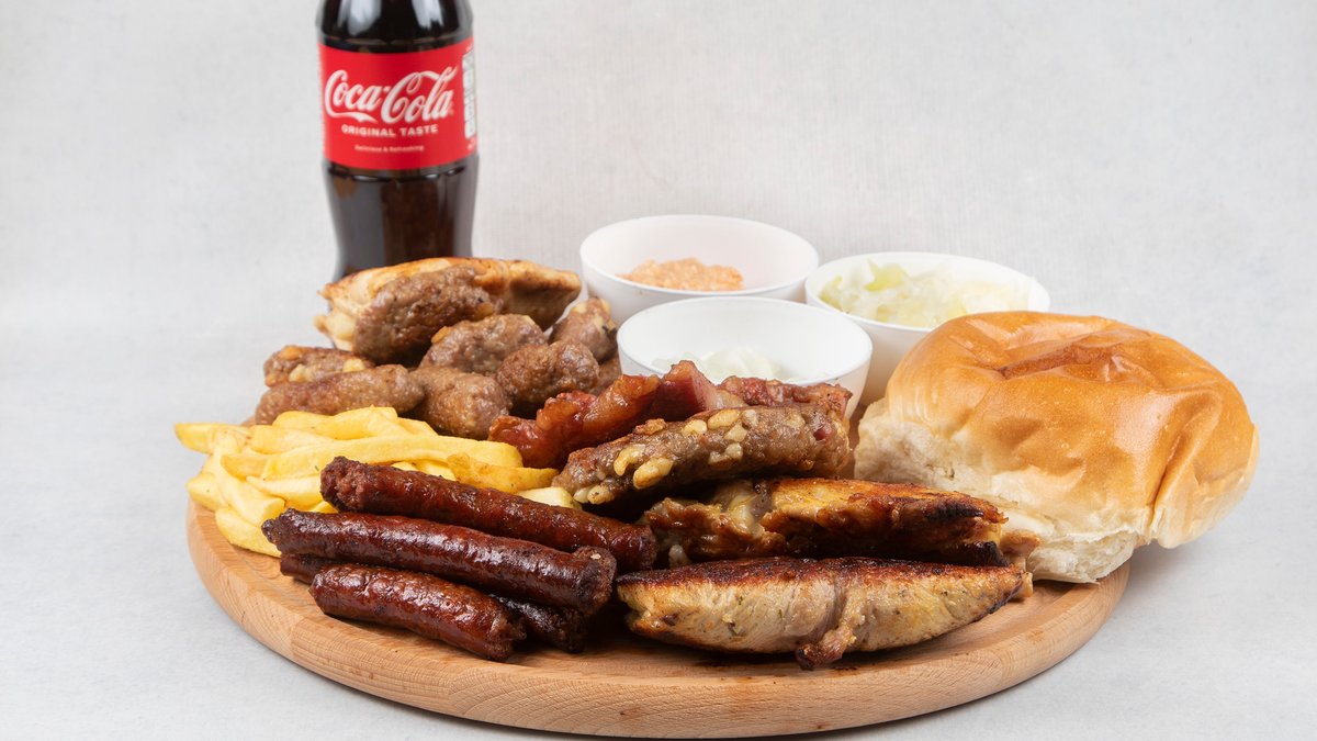 Gurmanska pljeskavica 200g, pileći batak 150g, kobasica 200g, vešalica 200g, dimljena slanina 200g, ćevapi 2000g, rolovano pileće belo 200g, leskovački uštipci 200g, pomfrit 500g, lepinja 5kom, kupus slata,luk,urnebes, Coca Cola 1.5l