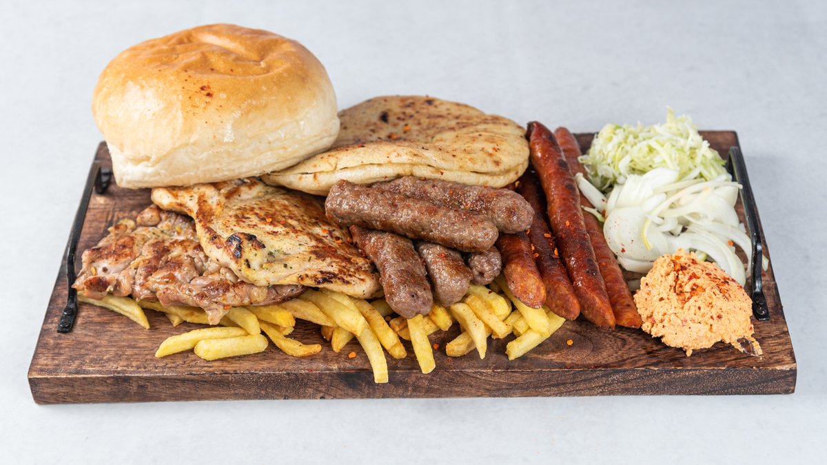 Ćevapi 200g, pileći file 200g, pileći batak 200g, roštiljska kobasica 200g, pomfrit/pekarski krompir 300g, mix salata, 2 somuna/lepinje