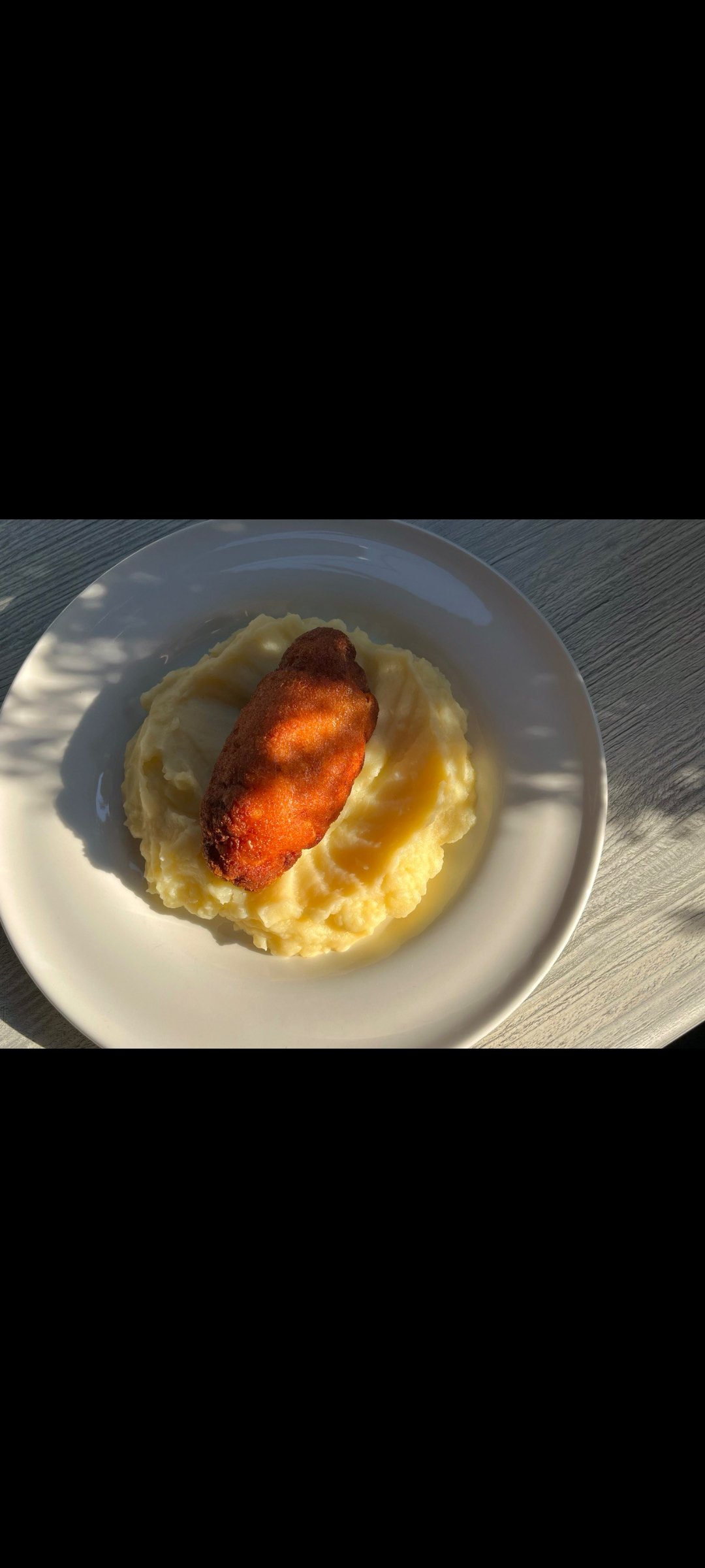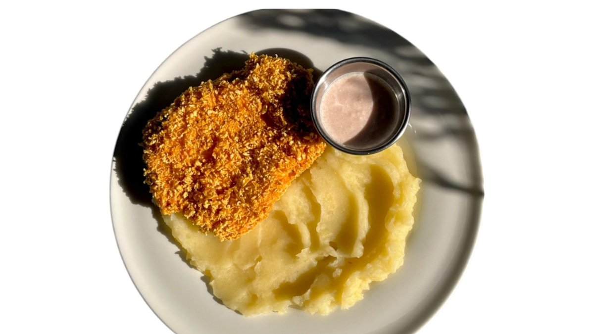 Pileći šnicla sa pastom od crnog tartufa, tartuf majonezom, sirom, mešavinom zelene salate i tost hlebom.