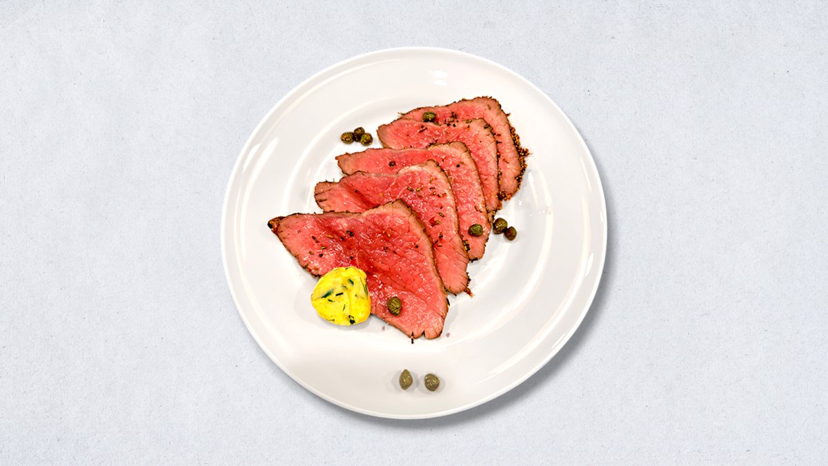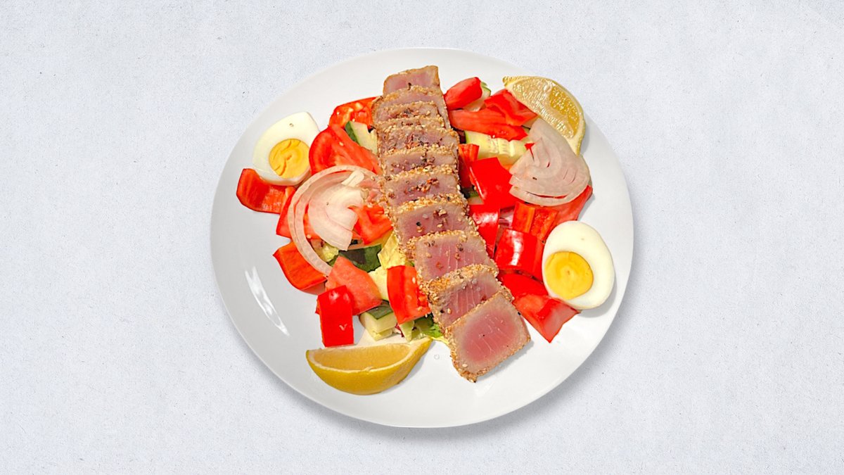 Rukola, salatni miks, biftek, crvena paprika, sos