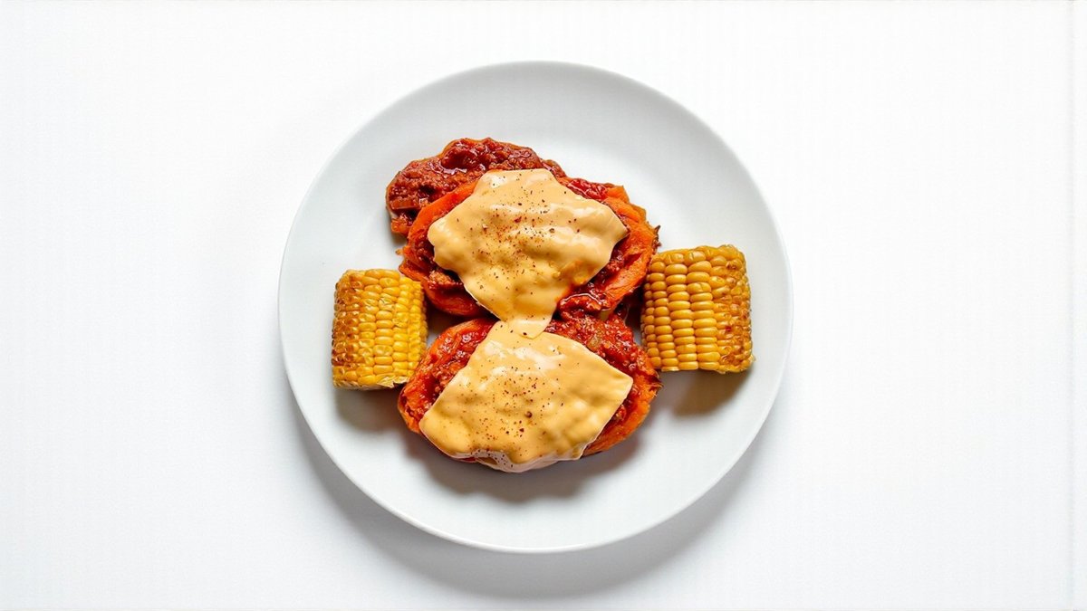 batat, goveđi mleveni nadev, paradajz, luk, sir čedar, kukuruz, začini