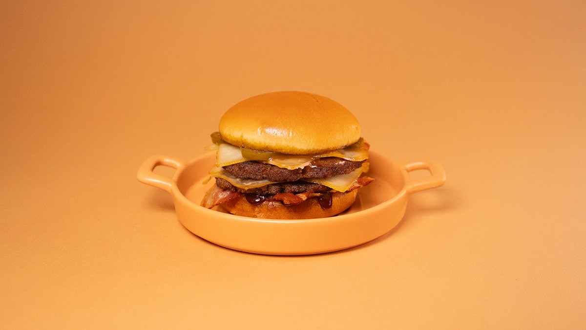 Dve juneće pljeskavice, dimljena gauda, Jalapeño, BBQ, sweet chili, slanina, brioche zemička