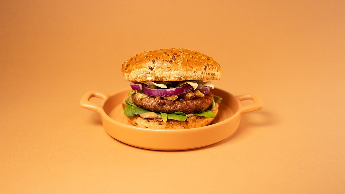 Vege pljeskavica, grilovane tikvice, crveni luk, baby spanać, tahini–limun, integralna zemička sa semenkama