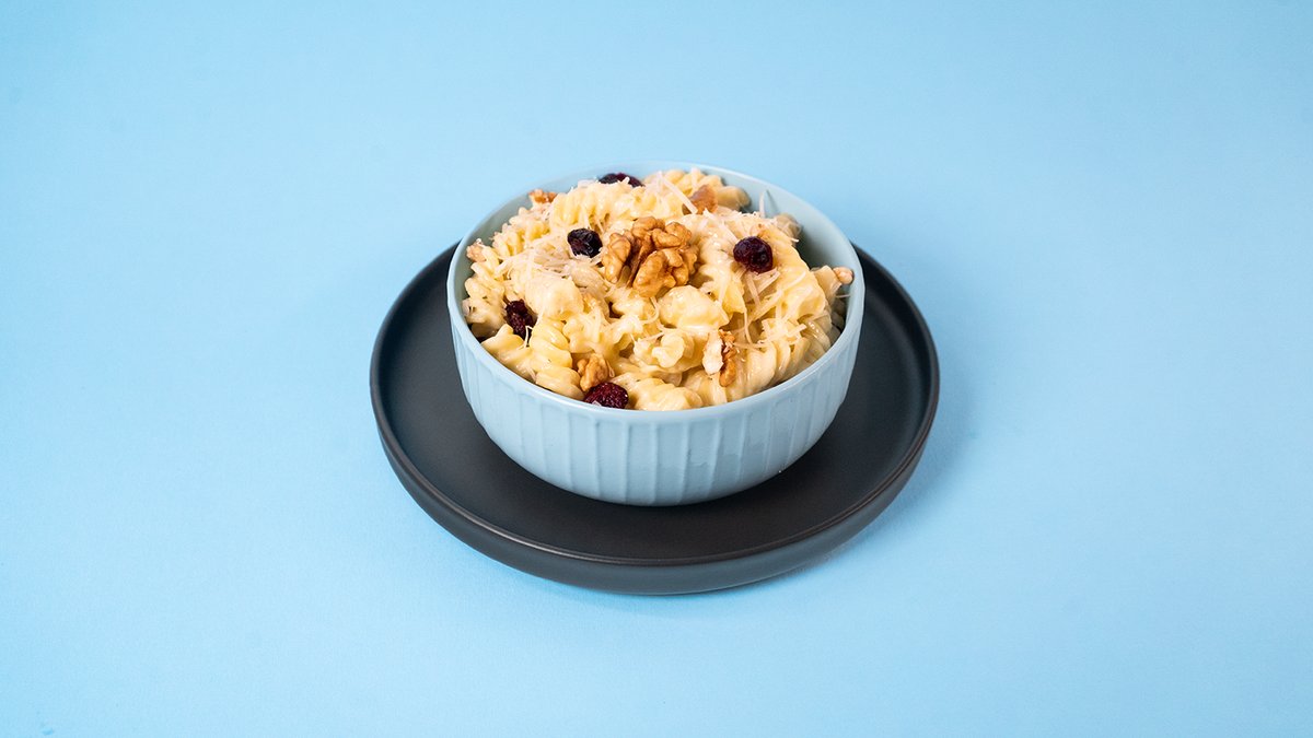 Fusili, neutralna pavlaka, mocarela, gorgonzola, parmezan, gauda, orasi, suve brusnice, rendani parmezan, biber