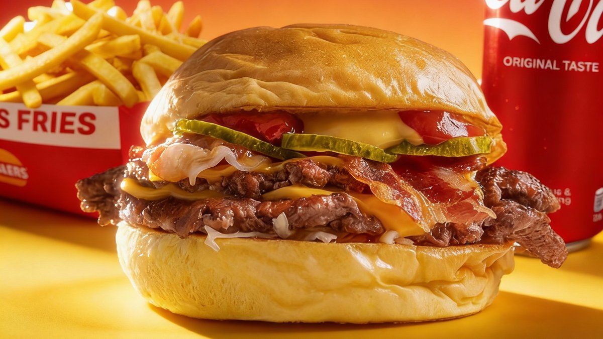 100% junetina 3x, americki sir 3x, kiseli krastavcici, Heinz® kecap, Heinz® senf, seckani luk, grilovana slanina u javorovom sirupu