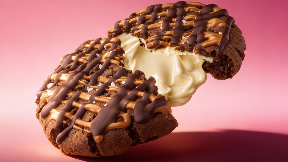 XXXL cokoladni cookie punjen belom cokoladom i preliven vrhunskom crnom i mlecnom cokoladom
