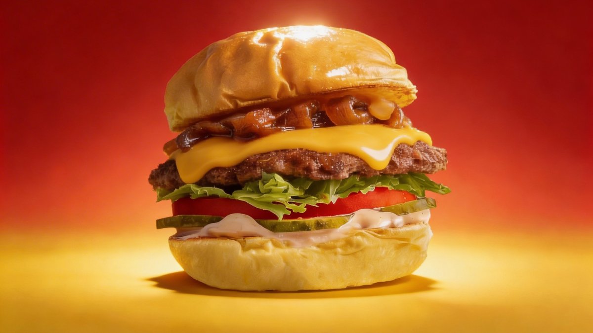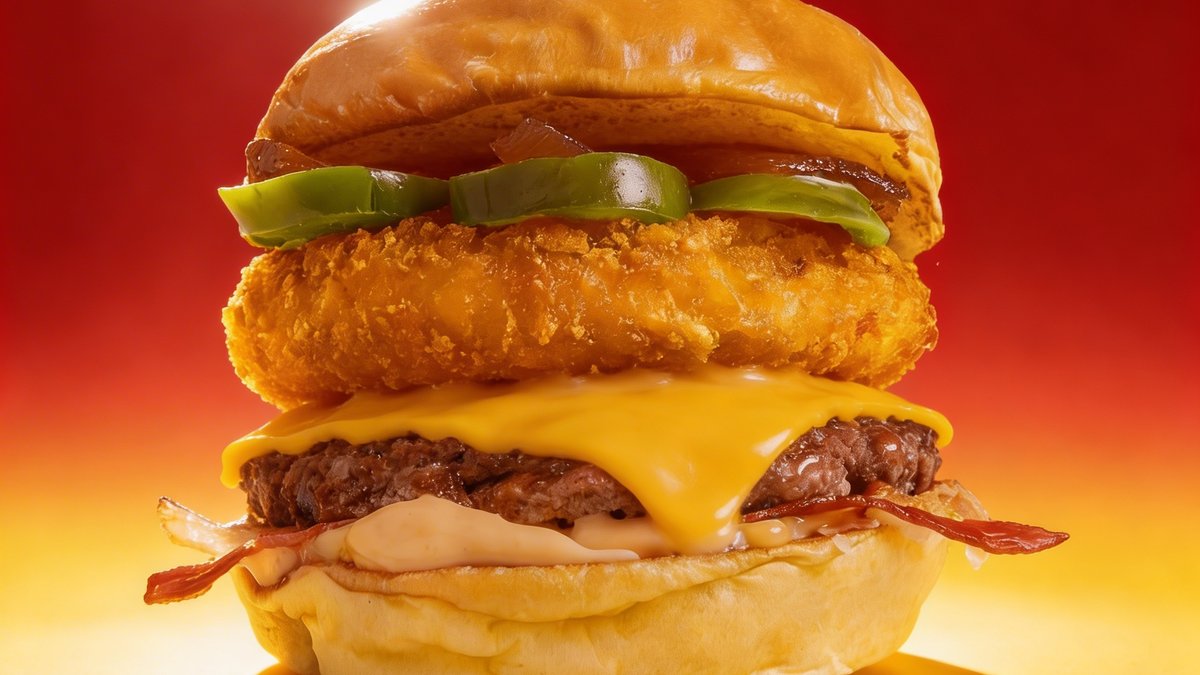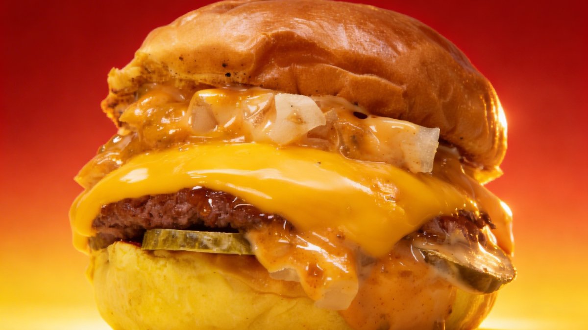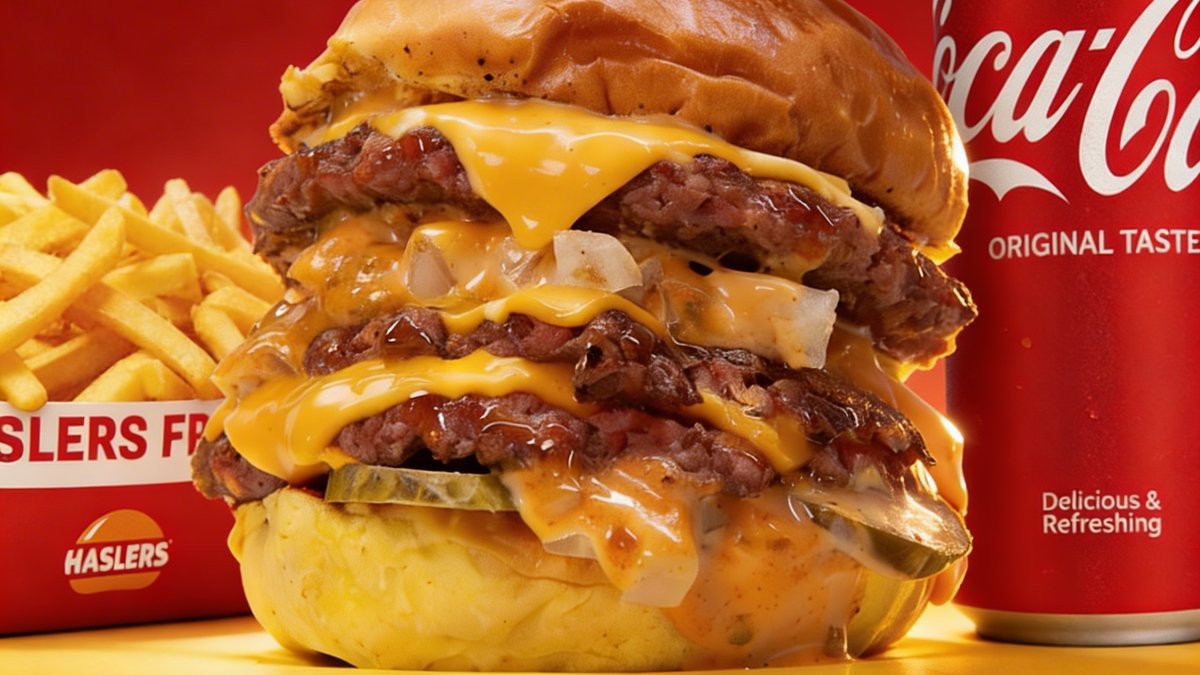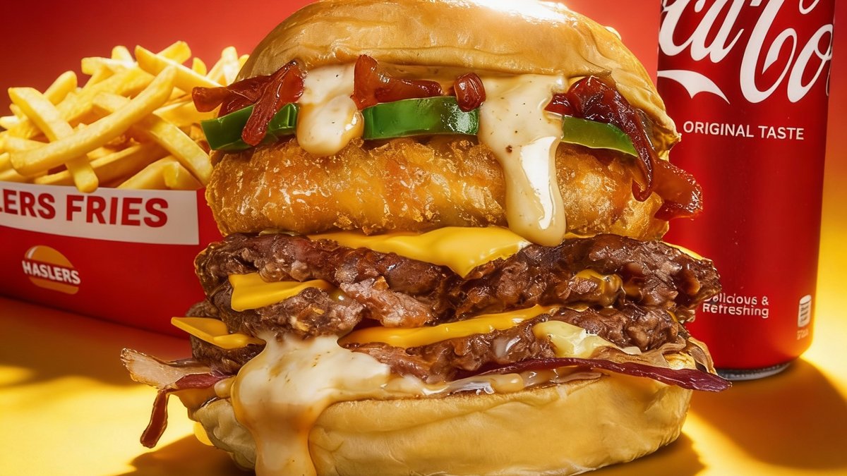 Dvostruki Cheeseburger sa slaninom presecen na pola i potopljen u luksuzni kremasti Haslers® cheddar sos. Vruca eksplozija sira u svakom zalogaju!