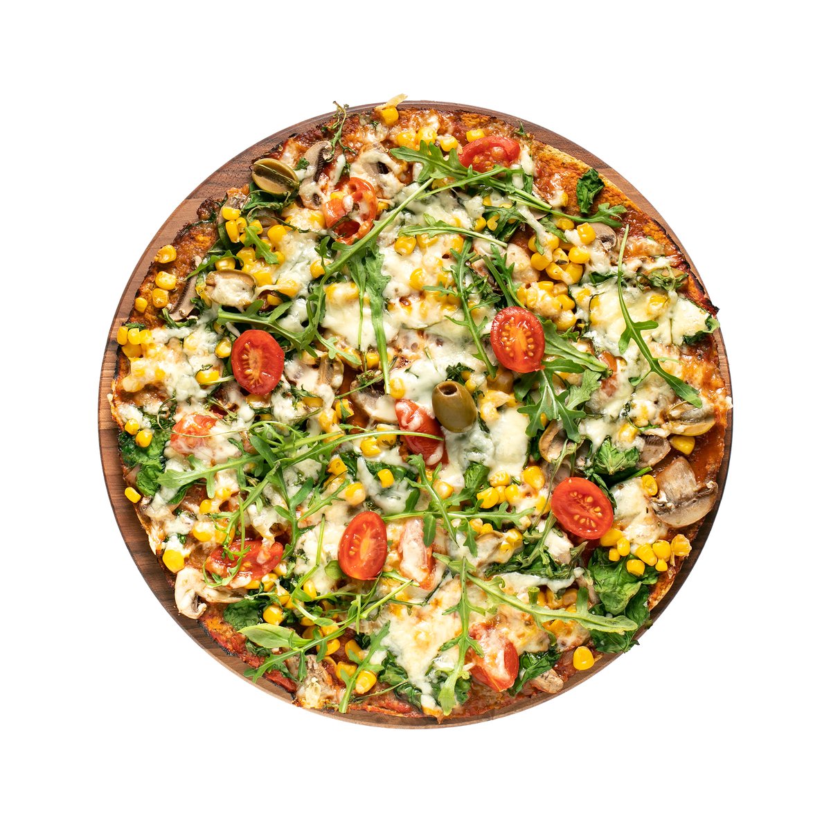 1944kCal; Sastojci:Ovsene pahuljice,čia seme,seme lana,spanać,kukuruz šecerac,šampinjoni,chery paradajz,maslina,kackavalj biljni,origano,maslinovo ulje,rukola,pelat paradajz, himalajska so